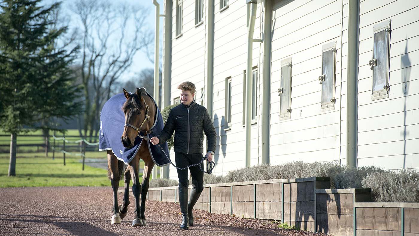 Harry leads Quantum Cruise around the yard. Heathcroft Farm, near Alton in Hampshire, is home to around 40 horses, of which 13 are competed by Harry.