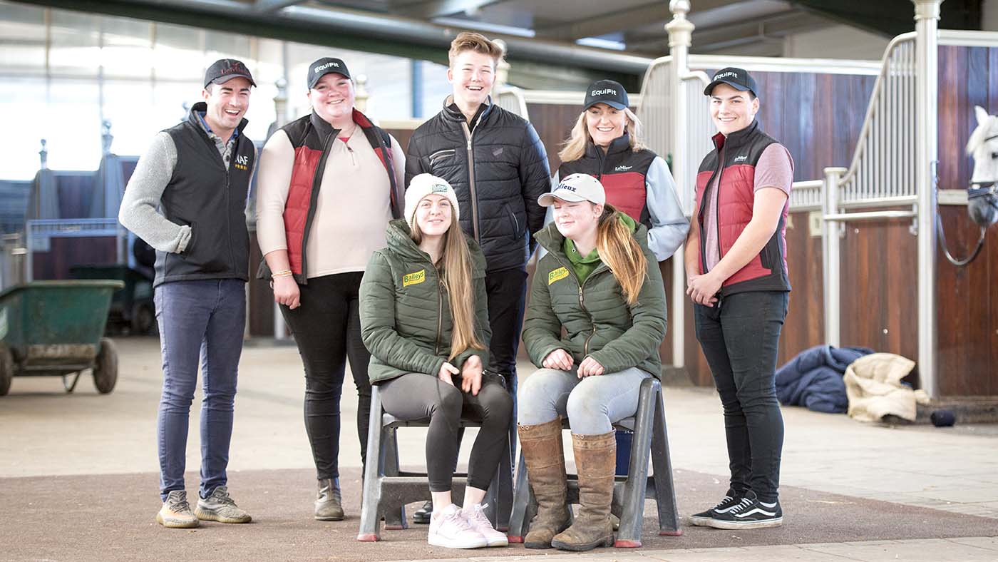 “You need a great team to keep everything going as I’m away so much,” says Harry. From L-R: head groom Dan Tarpey, Samantha Cobley, Harry, Olivia Bowen, Thomas Smith; bottom: Mia Newman and Georgia Baddeley