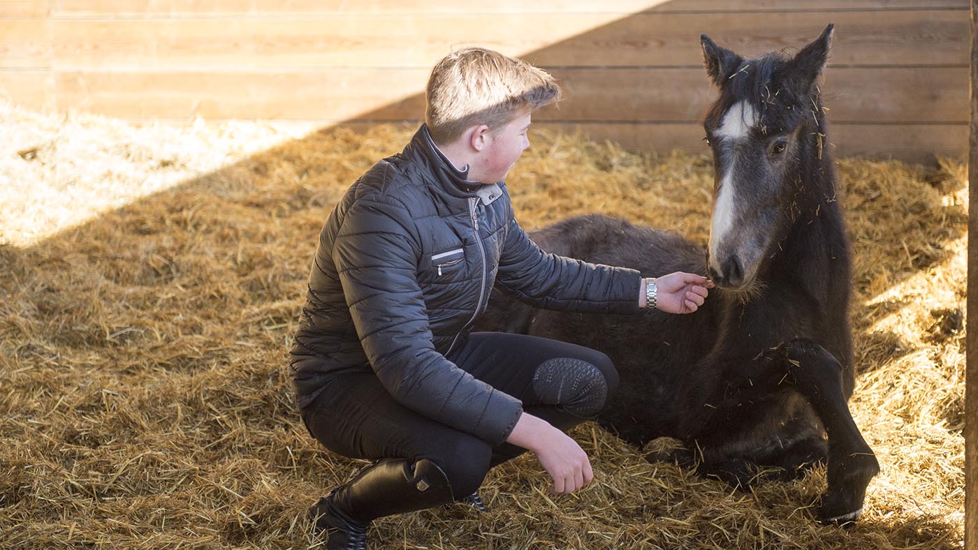 Harry with a foal in one of the barns. Harry leaves the stud side to his dad, who breeds around five foals a year and has a preference for the sire Cornet.