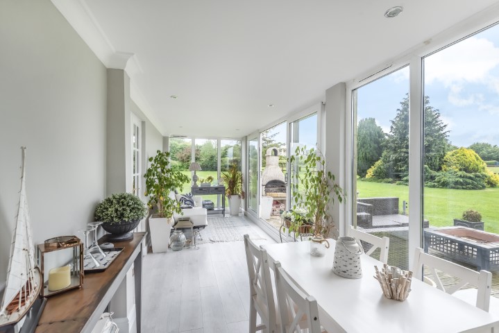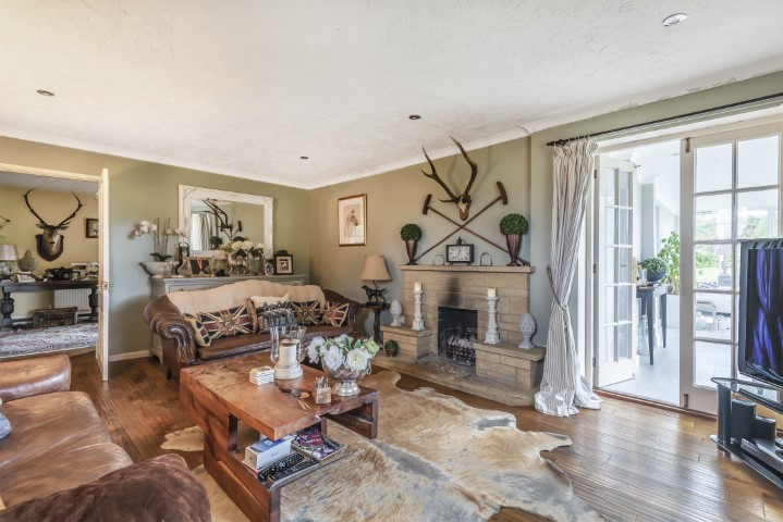 The drawing room has double doors opening to the garden room with sliding doors leading outside.