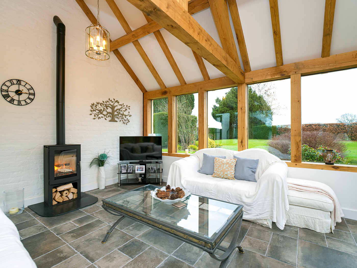 How cosy is this living room, complete with wood burning stove, feature window and exposed timber ceiling.