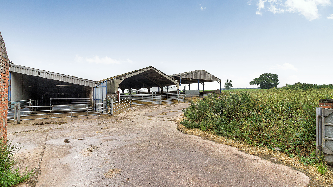 The modern agricultural buildings comprise a brick and tile open-fronted livestock shed, a three-bay Dutch barn, a single-bay monopitch building, a five-bay (22.7x19m) steel portal frame, a livestock shed with fibre cement roof, cladding and raised central feed passage, a steel framed five-bay lean-to (22.7×6.17m) housing a former dairy and milking parlour, a five-bay (22.7×10.5m) concrete portal framed livestock shed with fibre cement roof and cladding to one side, a five-bay (22.7×11.5m) steel portal frame livestock building with a raised feed passage, fibre cement roof and part concrete block walls, an eight-bay (36.6×11.05m) concrete portal frame general purpose building with concrete floor, fibre cement roof and concrete block walls and a disused brick and steel framed milking parlour.