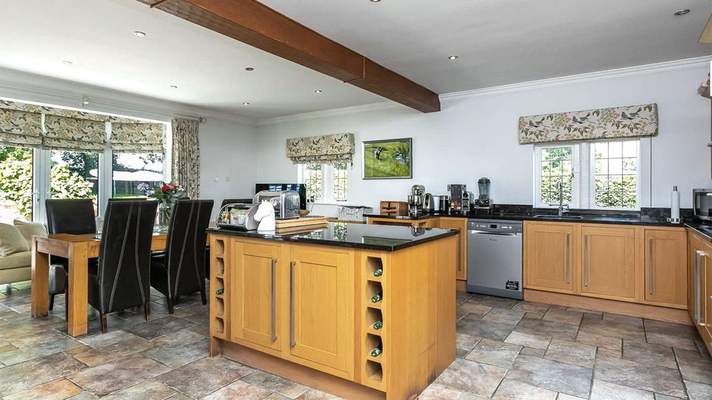 The large dining kitchen has a bay window with doors leading to the garden, a central island and granite worktops. There is also a walk-in pantry.