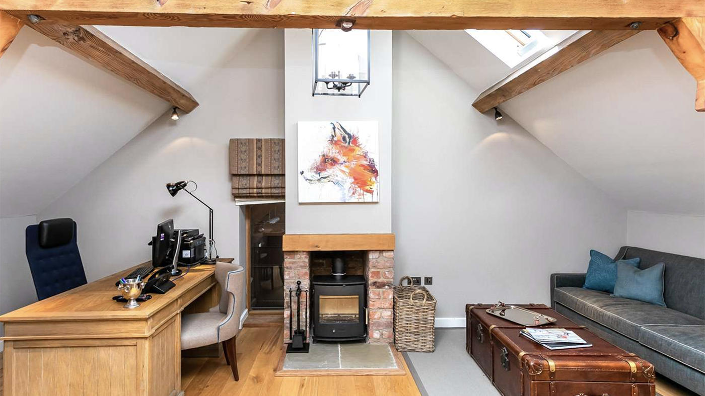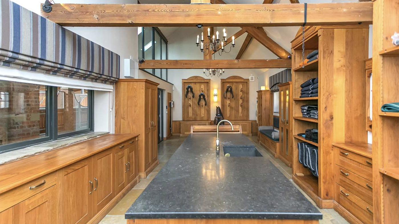 The luxury bespoke tack room has been fitted with stone flag flooring, underfloor heating, a vaulted ceiling and exposed beams with custom-made storage.