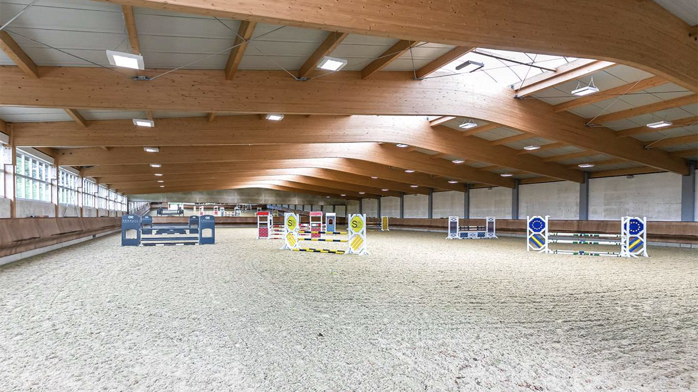 The international-sized arena is accessed via a landscape track from the stable yard. It is 60m long and it is covered with an Andrews Bowen surface. An Equa-Flow system harvests water from the arena roof and irrigates the surface. There are curved kick-boards to the perimeter, a built-in sound system and mirrors. There are jump storage areas to one end.