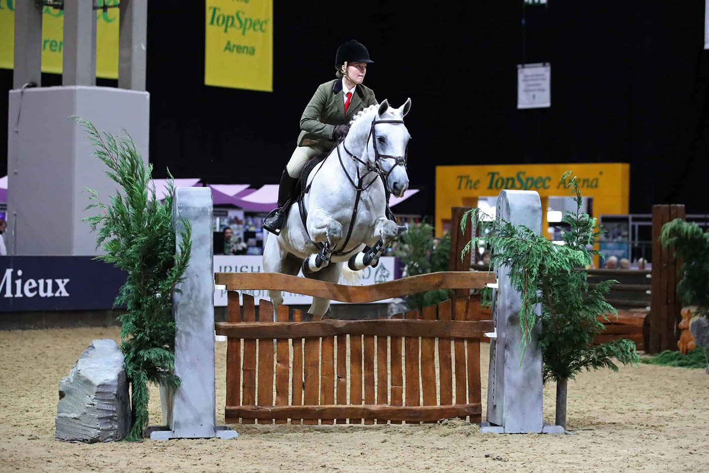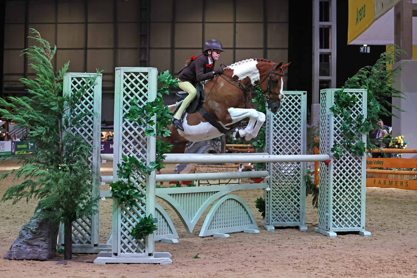 The 20-year-old skewbald gelding jumps the only clear in the 143cm working hunter pony section to reign with Gracie Aungier.