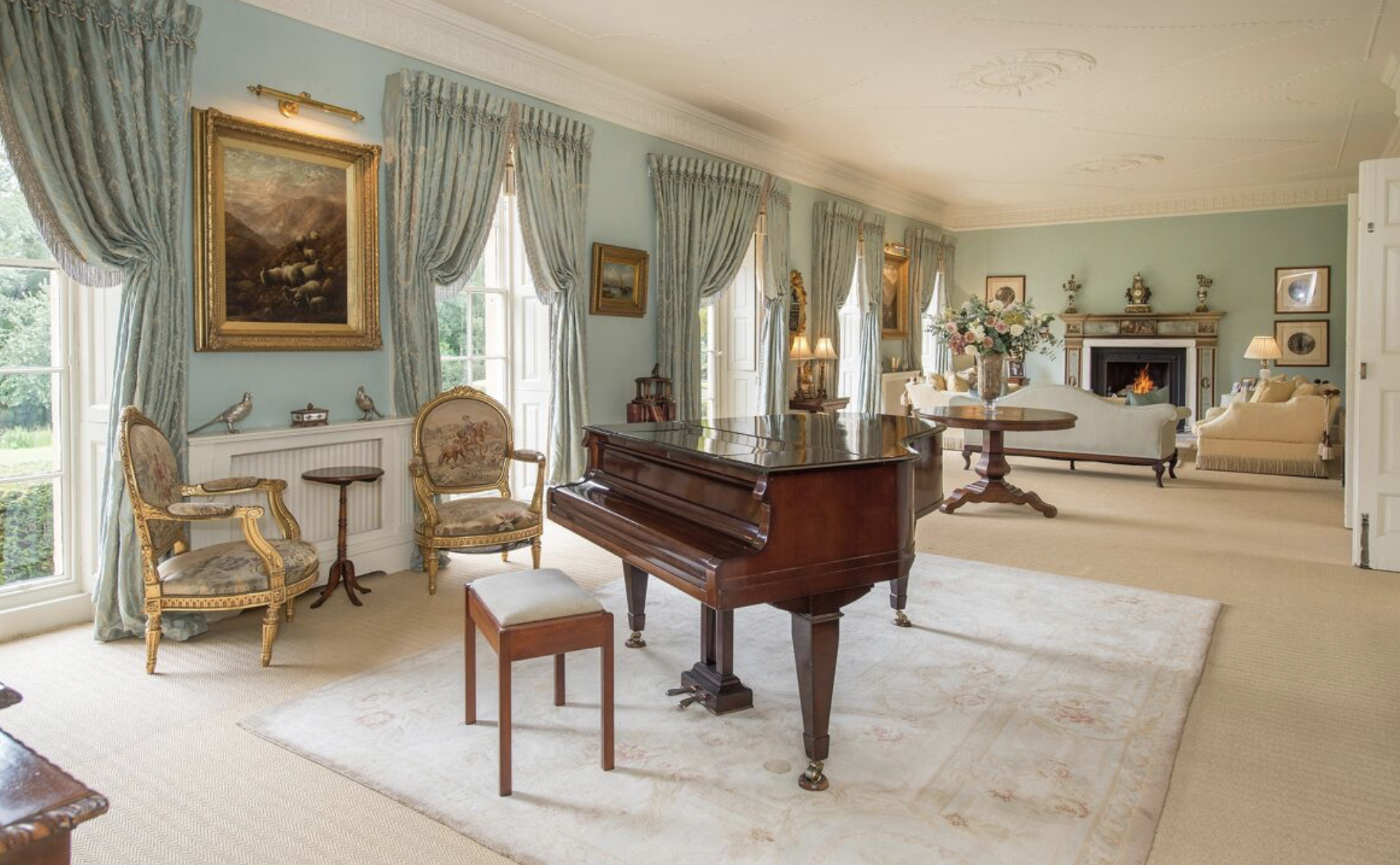From the hall, double doors lead into a drawing room which is over 46 feet in length and looks out over the garden and lake.