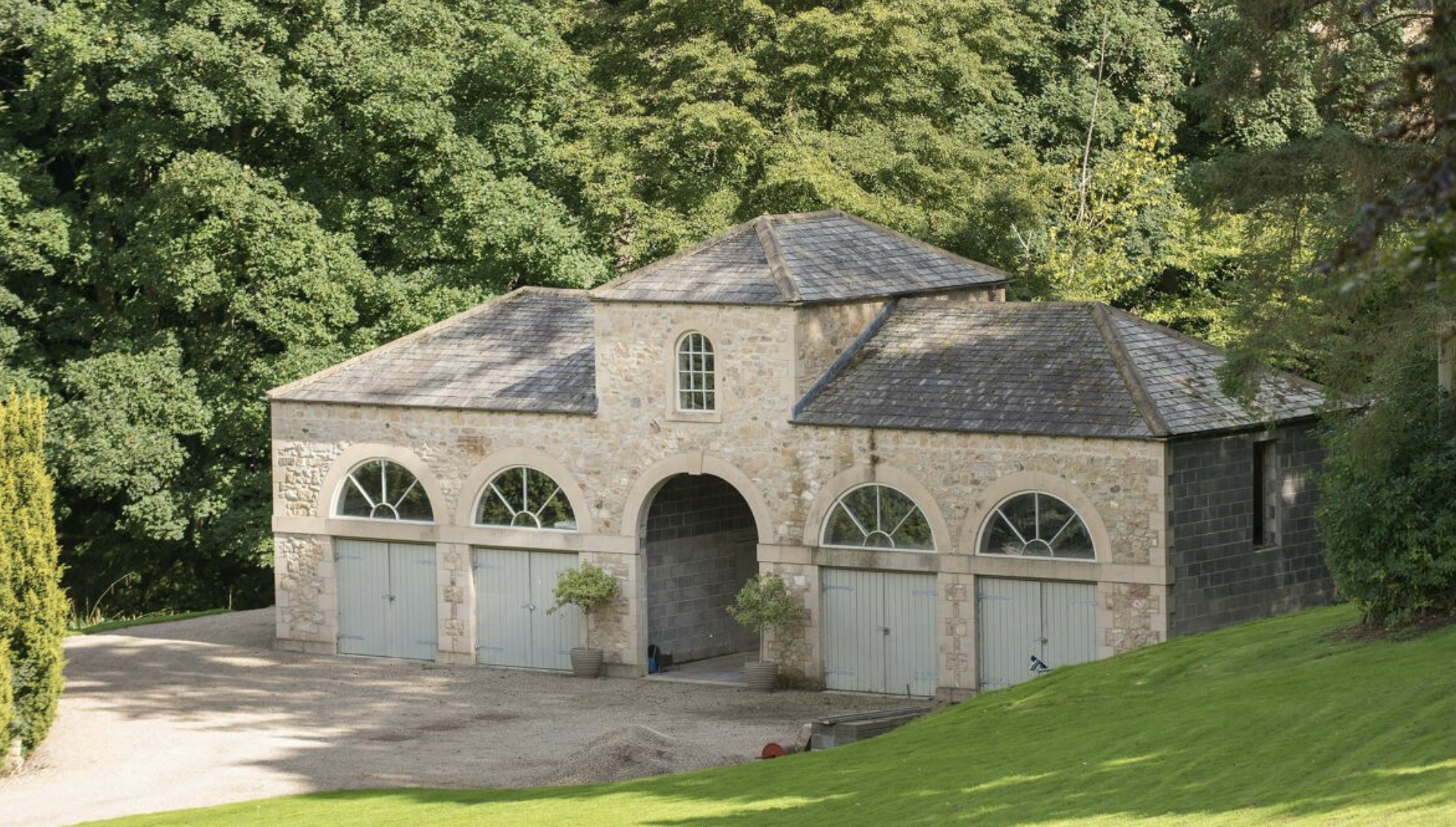 The Coach House is recently constructed in stone in an 18th Century style. It offers secure garaging for four cars, open garaging/dry storage, and separate stabling comprising four loose boxes and a yard. On the first floor is an office overlooking the lake.