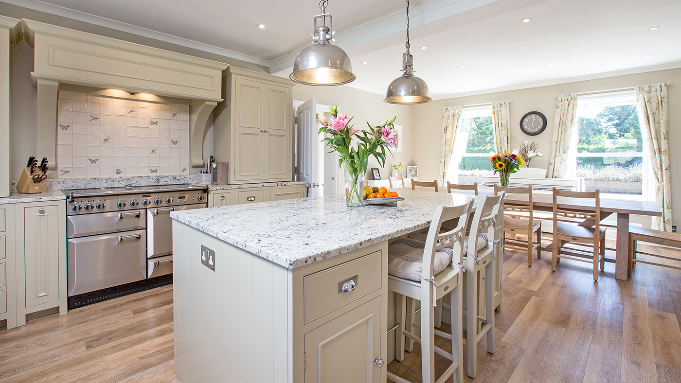 With far-reaching downland views, the main house includes a reception hall leading to a kitchen/breakfast room with bespoke solid wood cabinets, built-in appliances, central island and a Rangemaster stove.