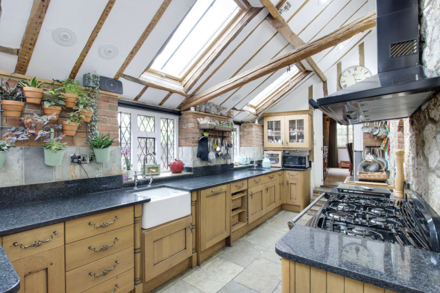 It has a country kitchen with exposed brickwork and exposed beams, plus a skylight. The kitchen is fitted with granite worktops, oak cupboards with an integral dishwasher and fridge.
