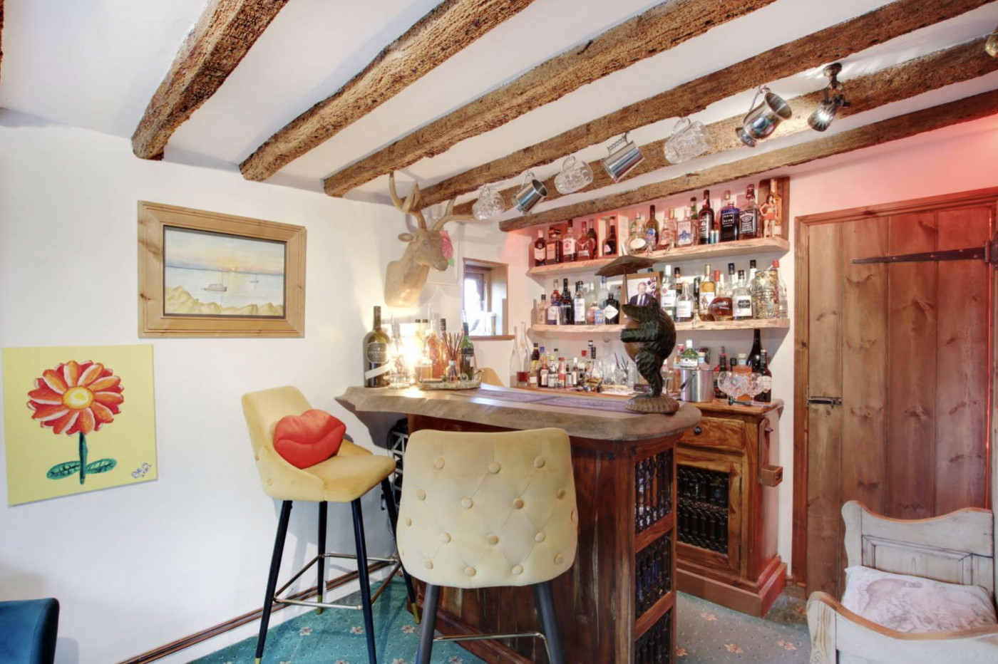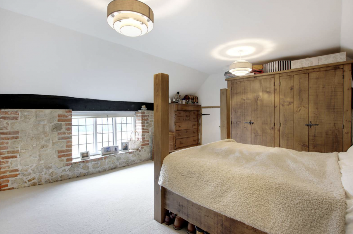 The three main reception rooms also feature brick and stonework, with beams throughout. There’s even a bar and snug off the sitting room and they are all linked by the vaulted reception hall.