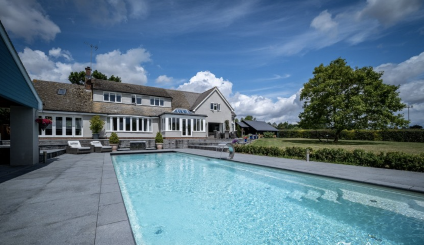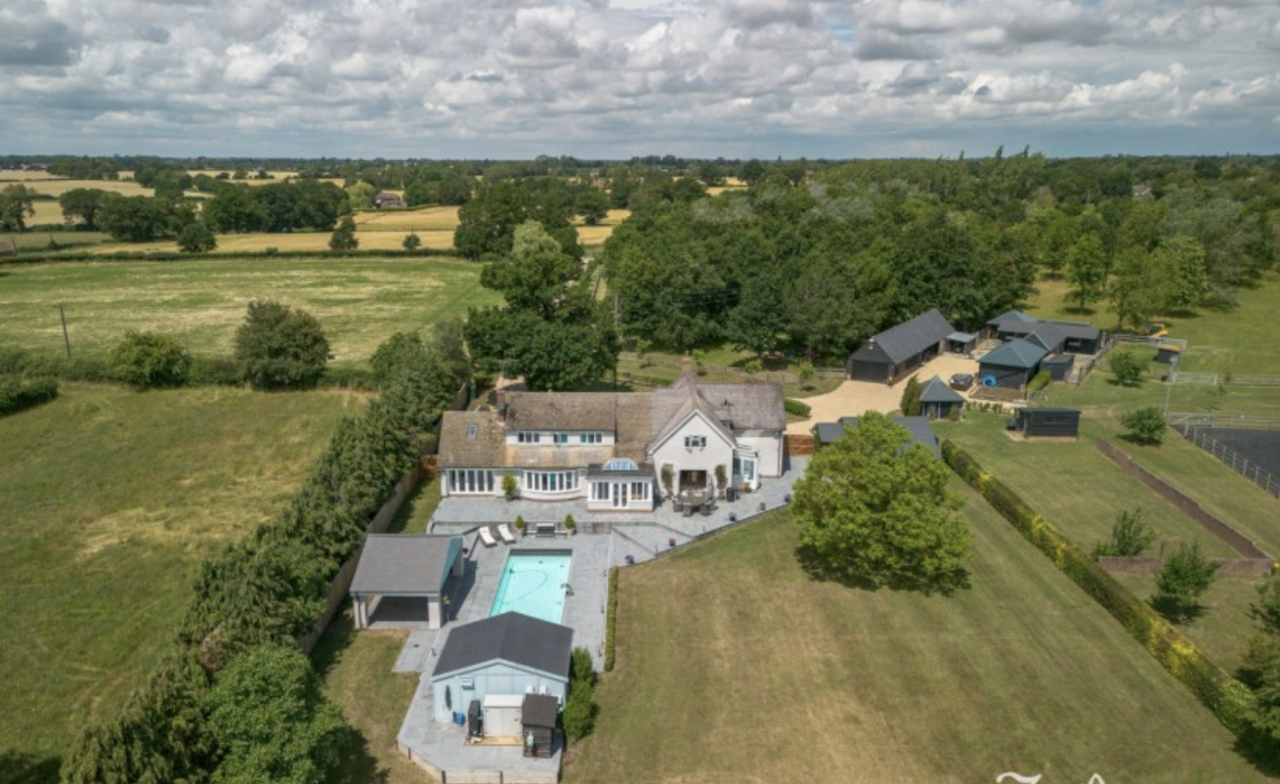 The equestrian home is between Great Leighs and Felsted in Essex. The area is known locally as the Golden Triangle for its accessibility to Chelmsford City, Great Dunmow, and Braintree. Chelmsford City Centre is approximately nine miles away and Boreham is 6.5 miles away. Great Dunmow is eight miles and Stansted Airport is just over 18 miles from the property.