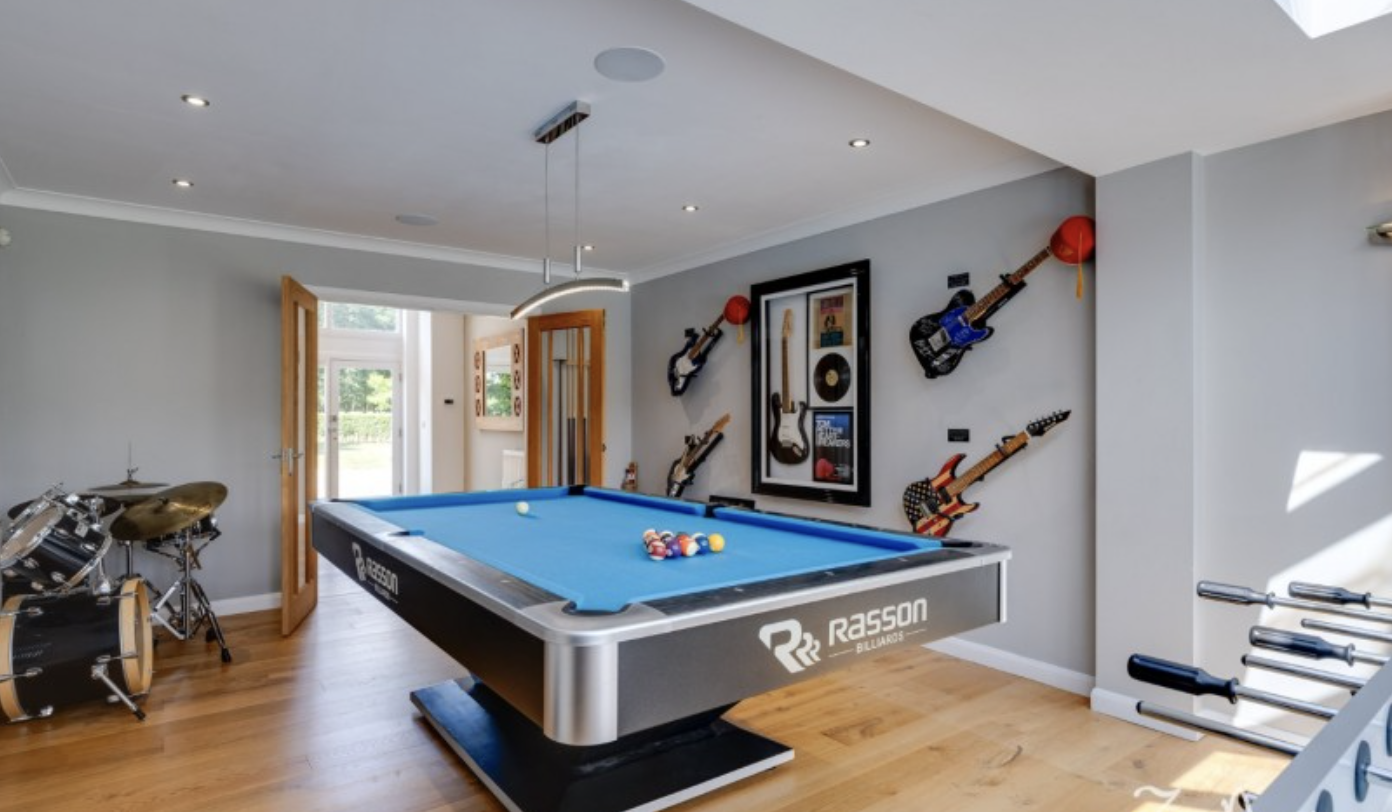 In the main house there is a vaulted entrance hall with a full-height gable window. From the hall are three reception rooms, including a formal dining room, games room with an atrium and a sitting room with a wood-burning stove. Beyond is an additional room currently used as a play/gaming room and a fourth reception room serves as an office with a heavily secured walk-in gun room.