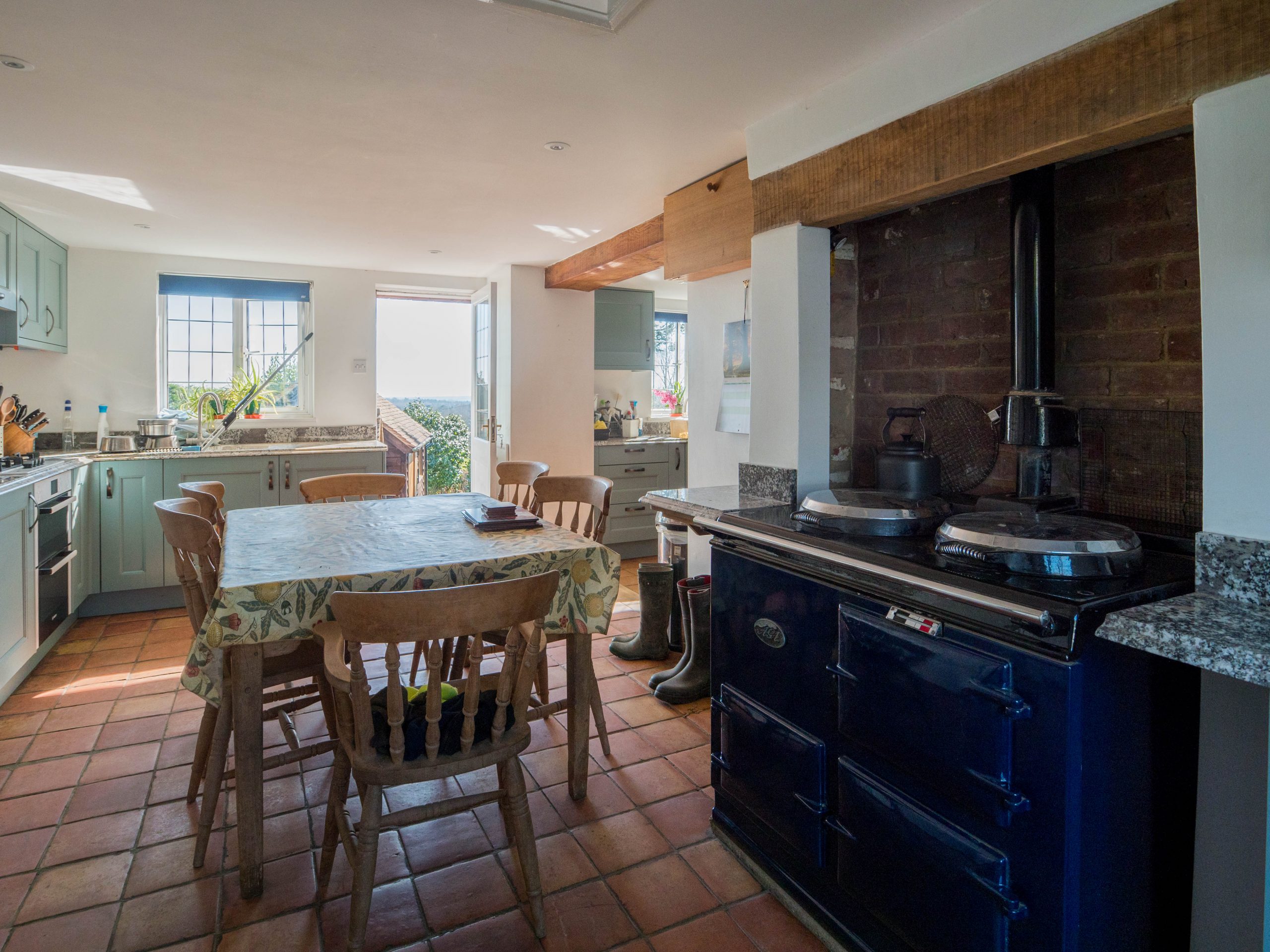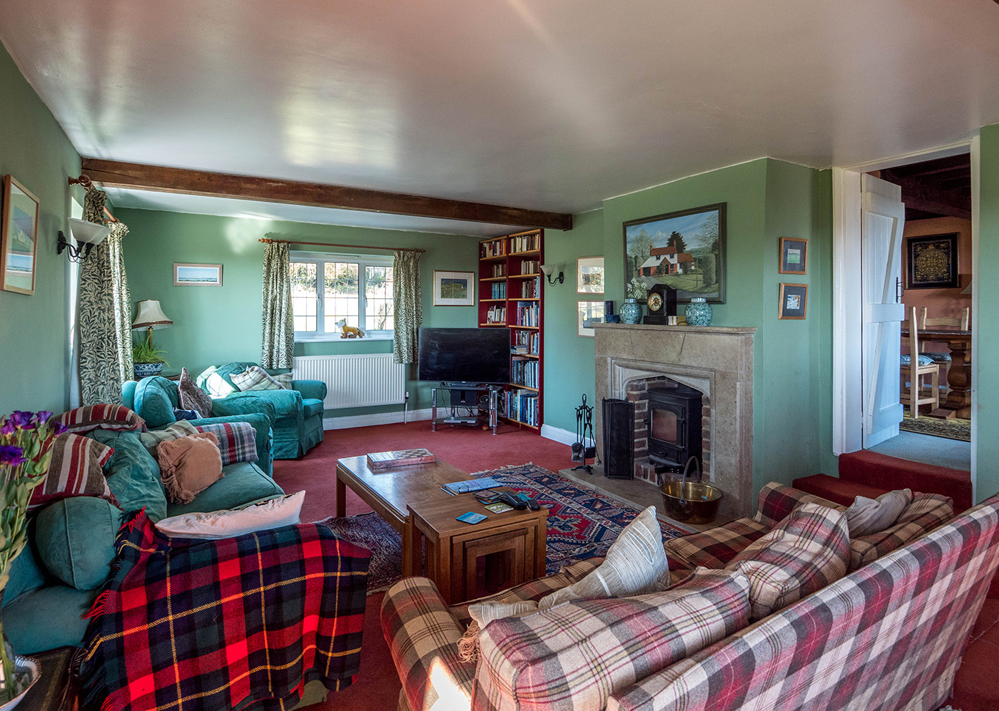Off the dining hall is a triple aspect sitting room with French doors leading directly out to the garden. It boasts exposed ceiling beams and fireplace with stone surround, hearth and wood burner.