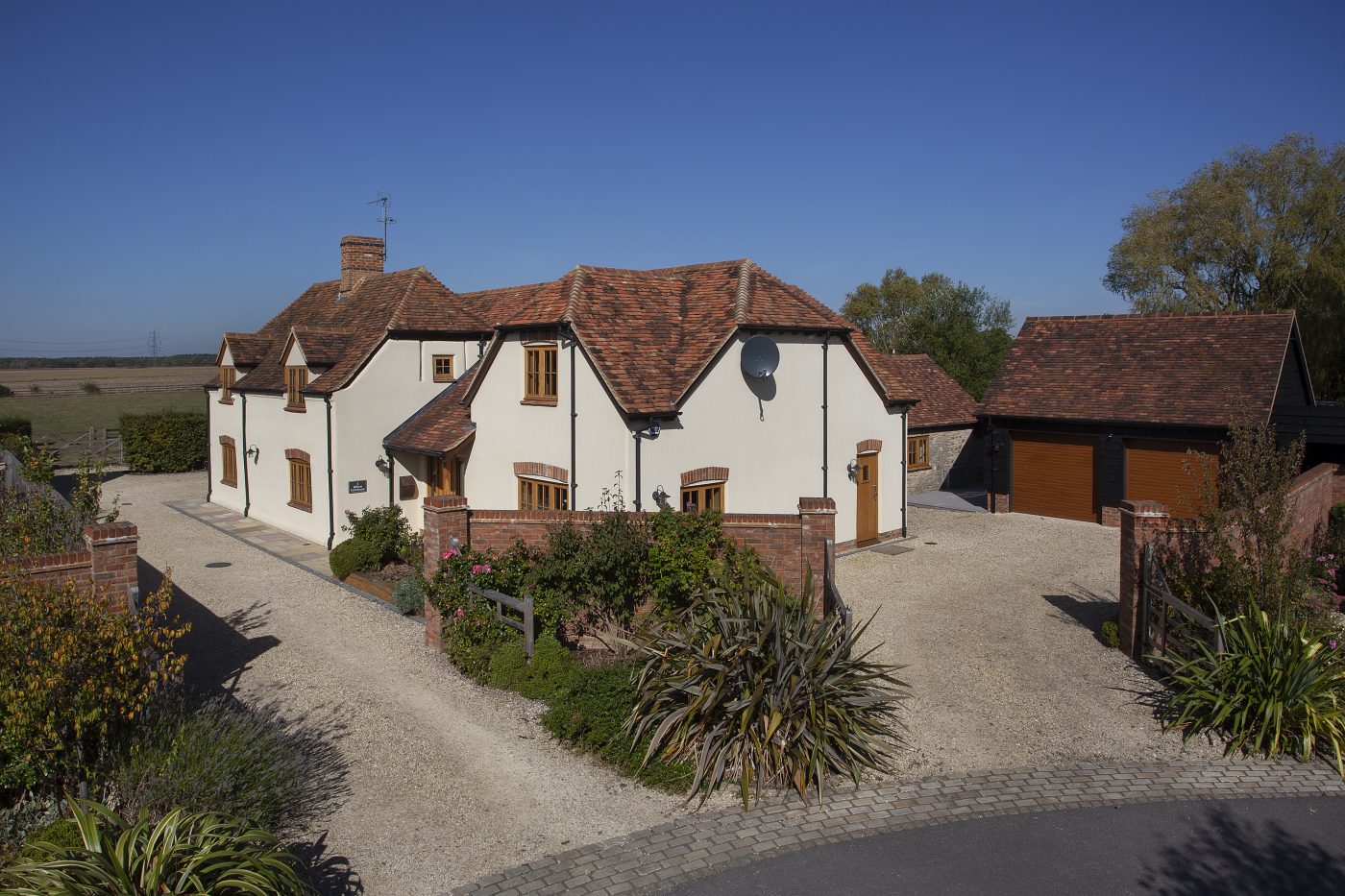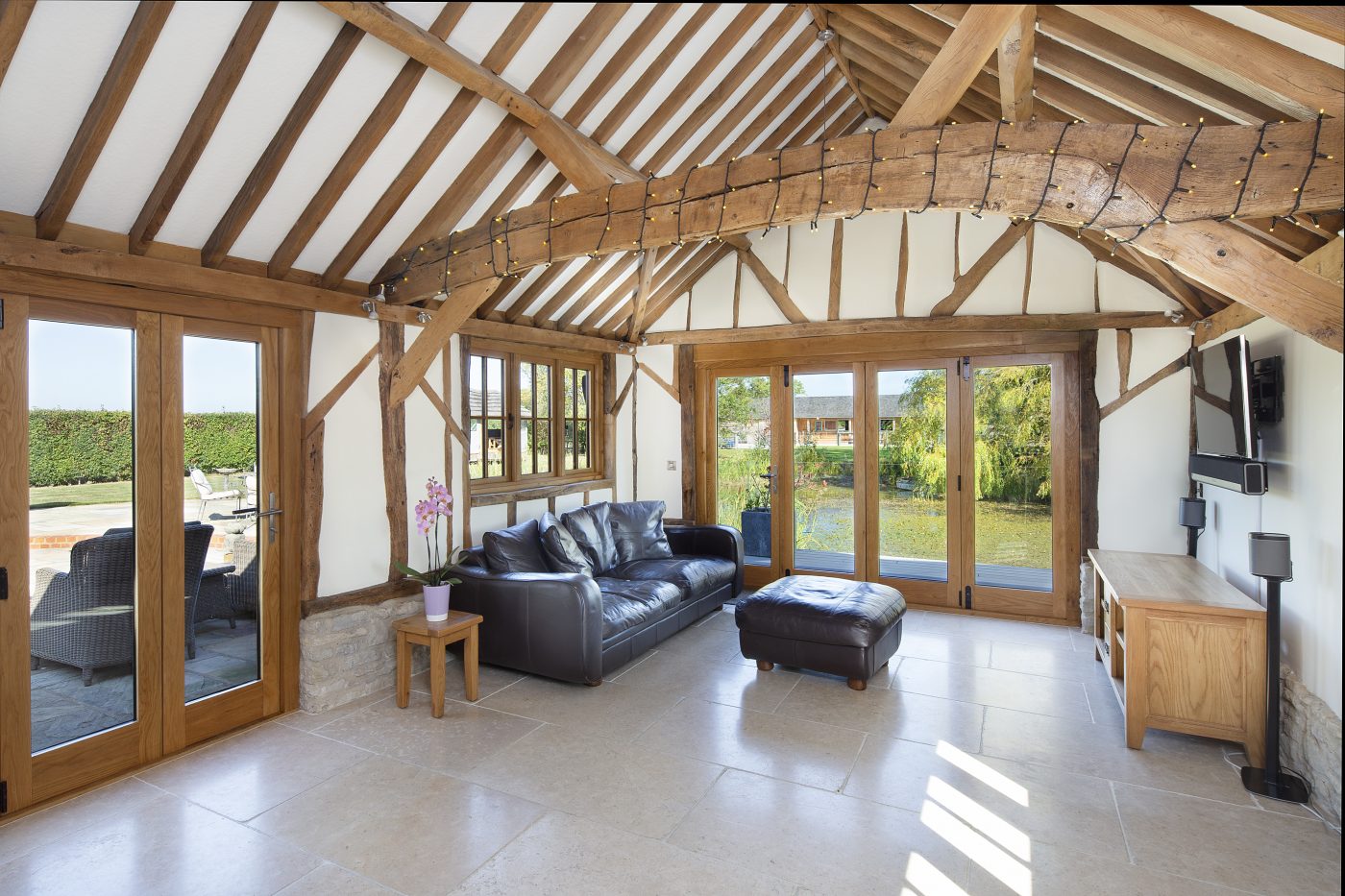 The house features a bespoke country-style kitchen and family room with oak beamed vaulted ceilings and bi-folding doors leading outside.