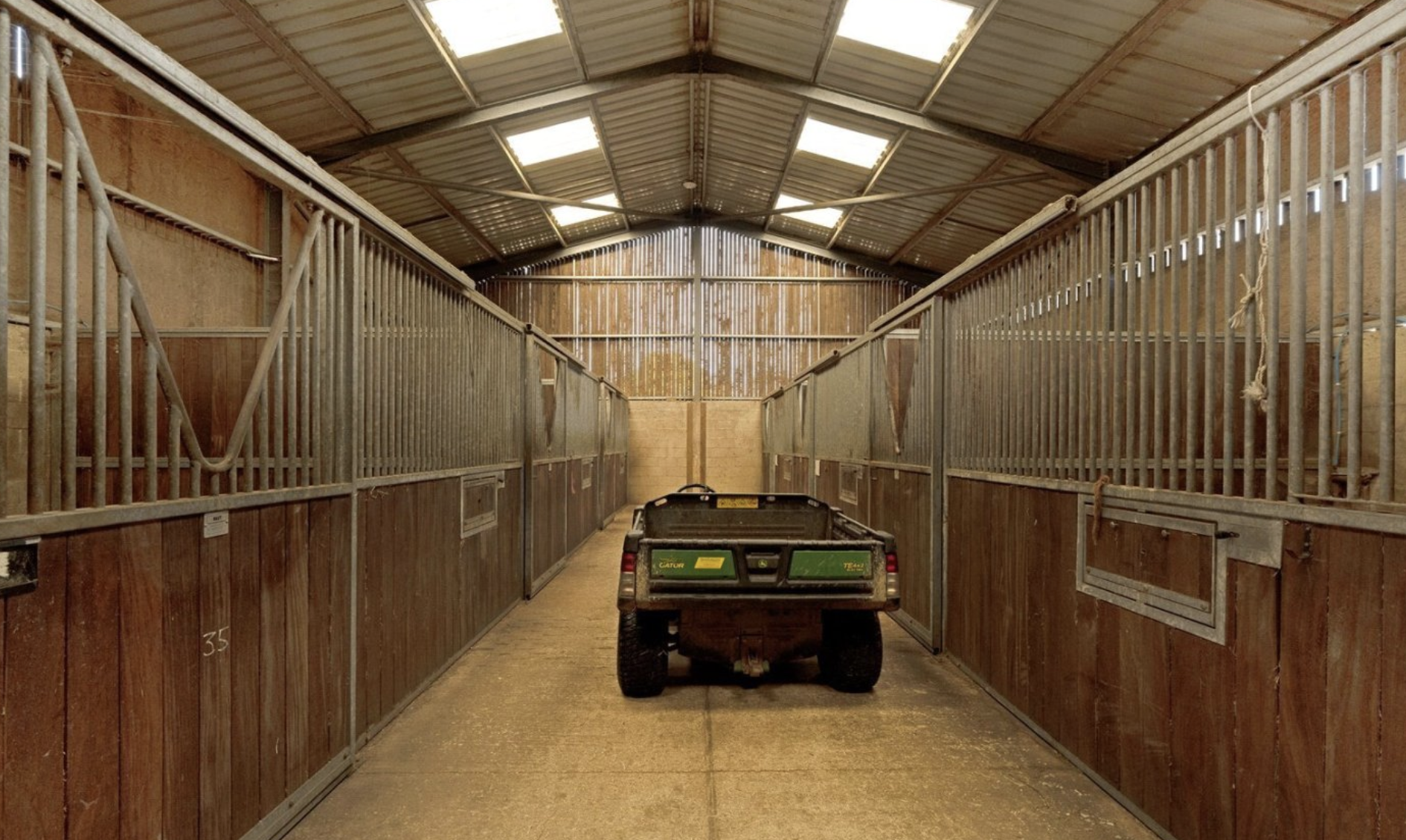 The general purpose portal frame barn is constructed of block work to 2.4m with a brick facing and Yorkshire boarding. The interior consists of seven loose boxes with demountable partitions. The box fronts have a swivel manger and all measure 4.5×4.2m. The barn is divided to a further section used for machinery and fodder storage.