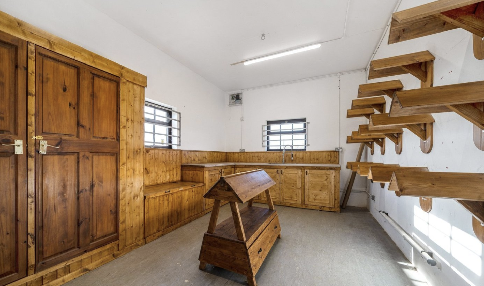 The stables measure 3.6×3.75m, with one larger corner stable, and all have traditional top and bottom stable doors with a side louvered window, and all with an opening rear window. There is rubber matting in 15 of the boxes, and fixings for water buckets and mangers. The larger central stable of 4.8×4.8m is equipped with a solarium and shower area. There is a staff room with kitchenette over the stable accessed from stairs to the rear. All stable doors are fitted with anti-weave bars and metal fixings to the bottom doors to prevent crib biting. Facilities within the yard include an office, WC, rug washing and further drying room, feed/medical room and a secure tack room.