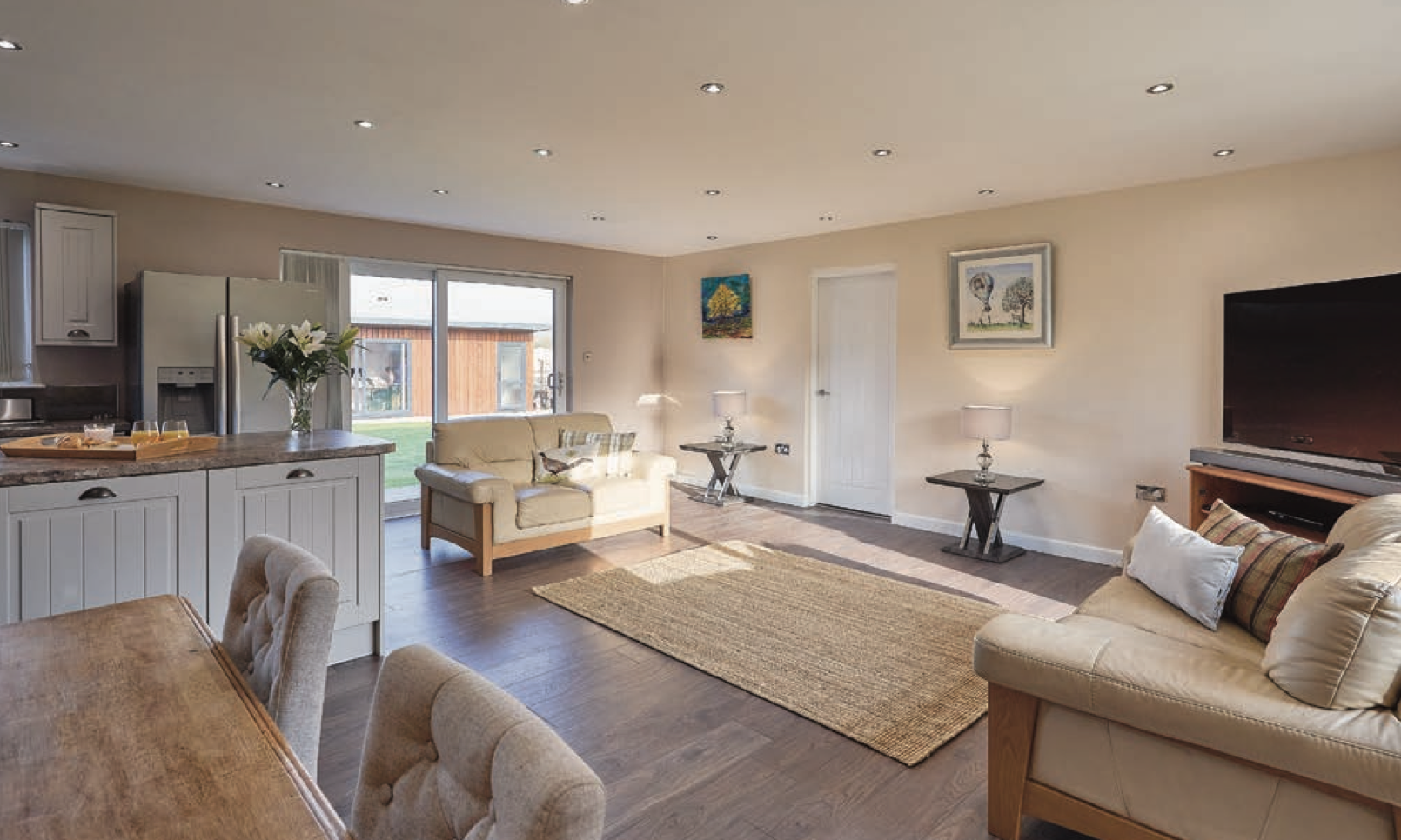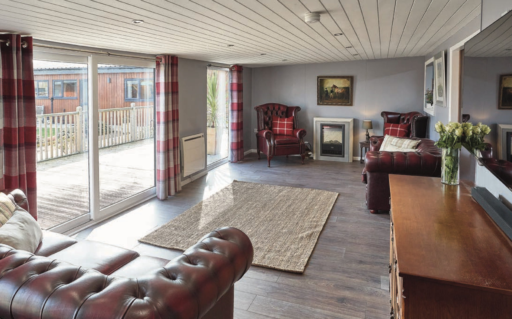 The first two-bedroom chalet was built around a decade ago and sits at a raised level with a bedroom stepping straight out to the decking through patio doors. The layout comprises of a utility room and separate WC, an open-plan kitchen-diner with additional breakfast bar island that wraps around to the living room and a modern shower room.