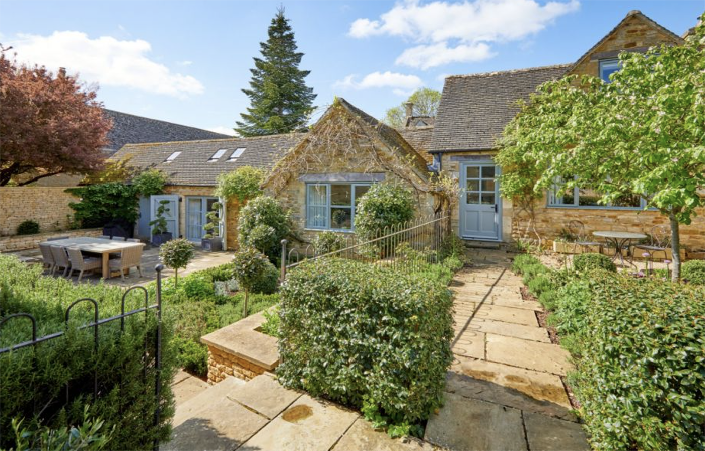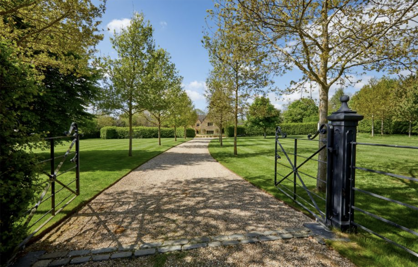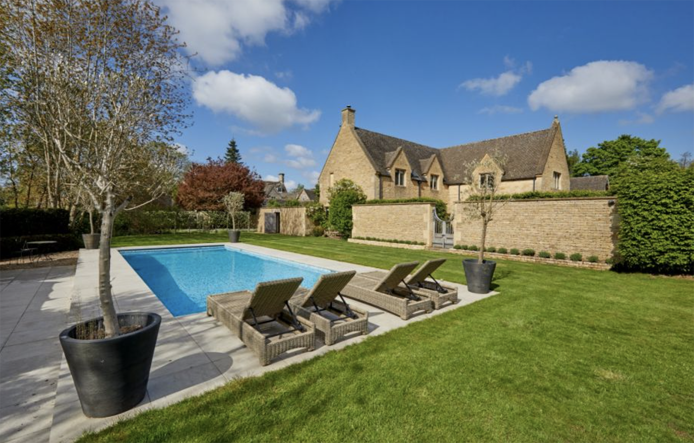 The main house is a Cotswold home with five bedrooms. It is surrounded by gardens, which are predominantly lawned with compartments interspersed with paved paths and stonewalling with stocked borders and mature shrubs.
