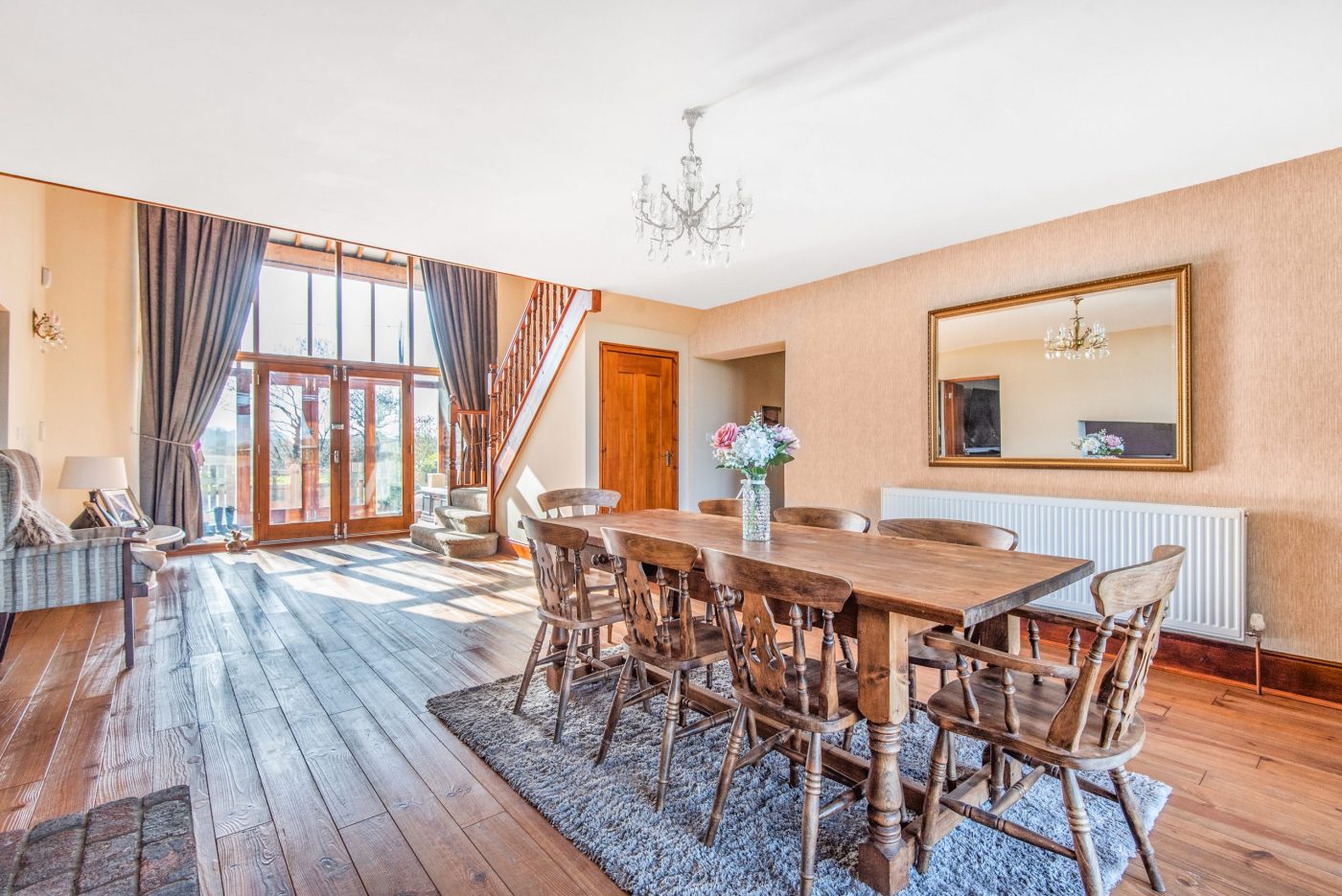 The home is approached via a private road and has a gated entrance with parking for several vehicles to the front and a fenced gravelled patio area. To the rear of the property there is a large fenced lawn, overlooking the five acres of land.