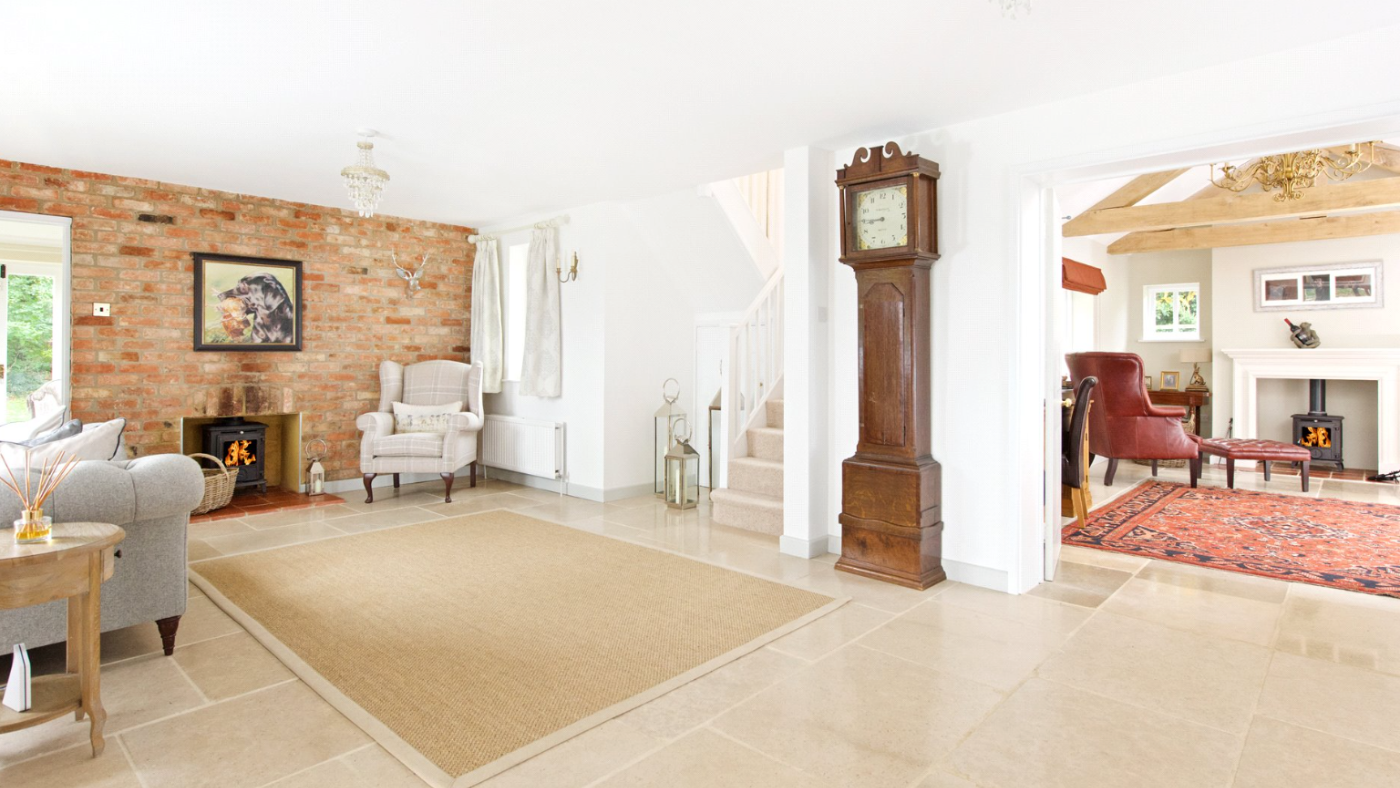 The reception hall has an exposed feature fireplace that has a log-burning stove. The flooring is French limestone and is found throughout the ground floor.