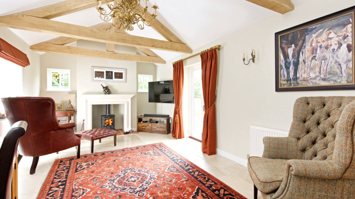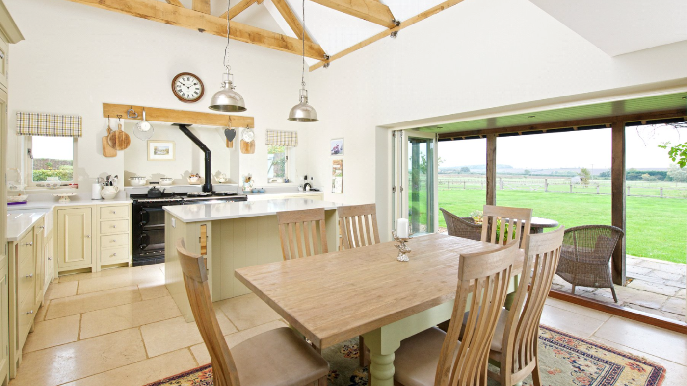 The kitchen/diner has a high vaulted ceiling with exposed beans and timbers. The bespoke, hand-painted fitted units include a central island. All work surfaces are granite.