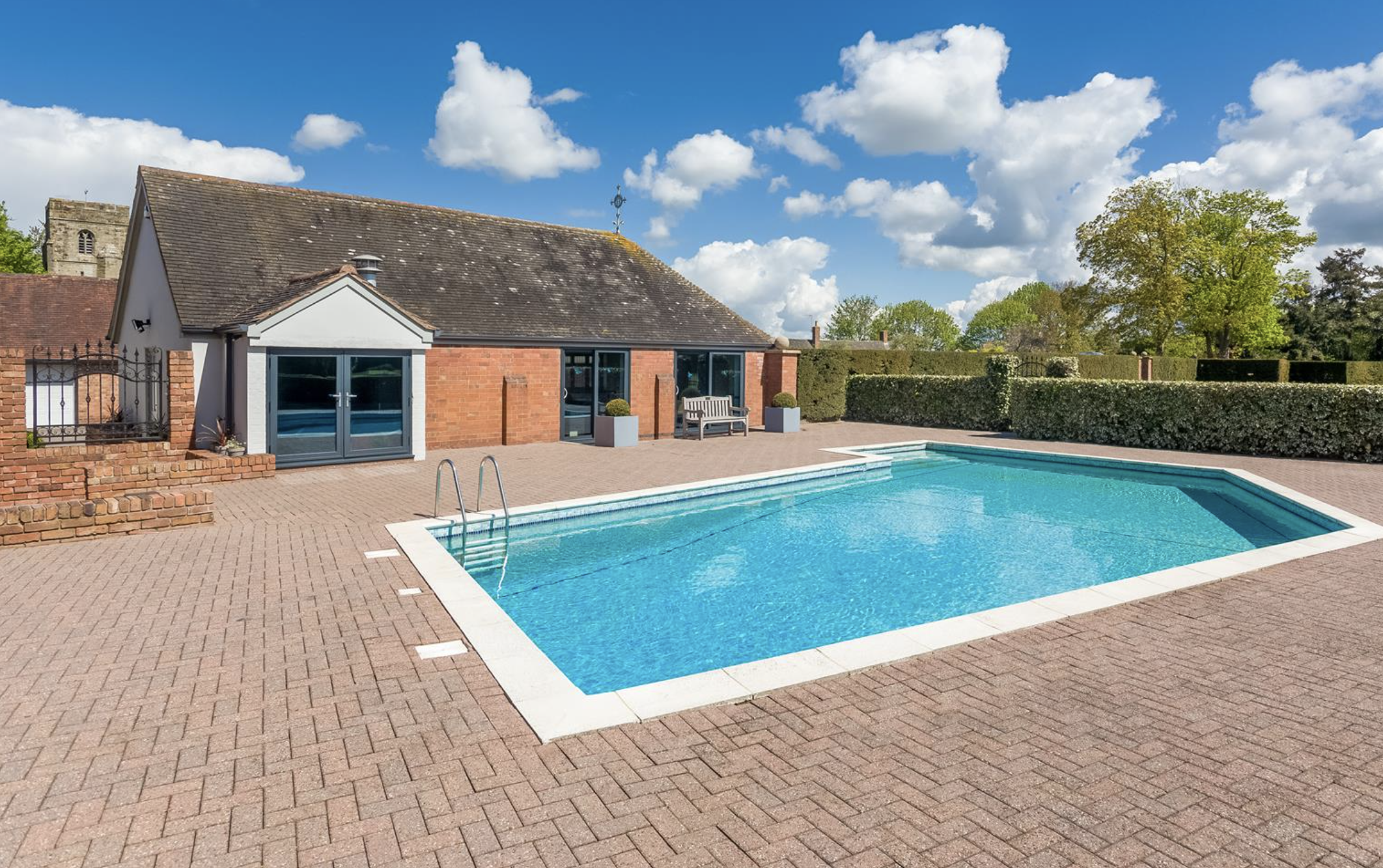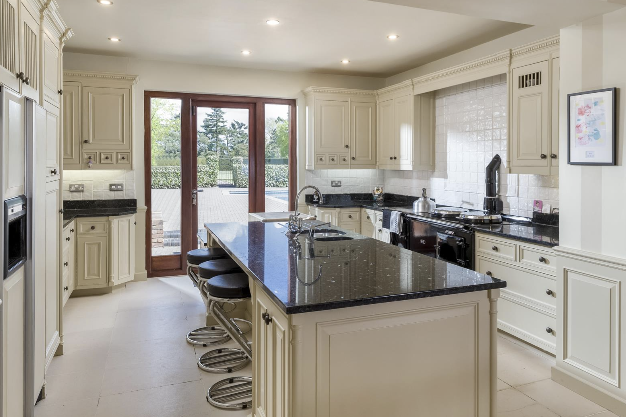 There is also a sitting room and the kitchen/breakfast room features granite work tops, AGA, central island and has easy access to the rear gardens, pool, and home office.
