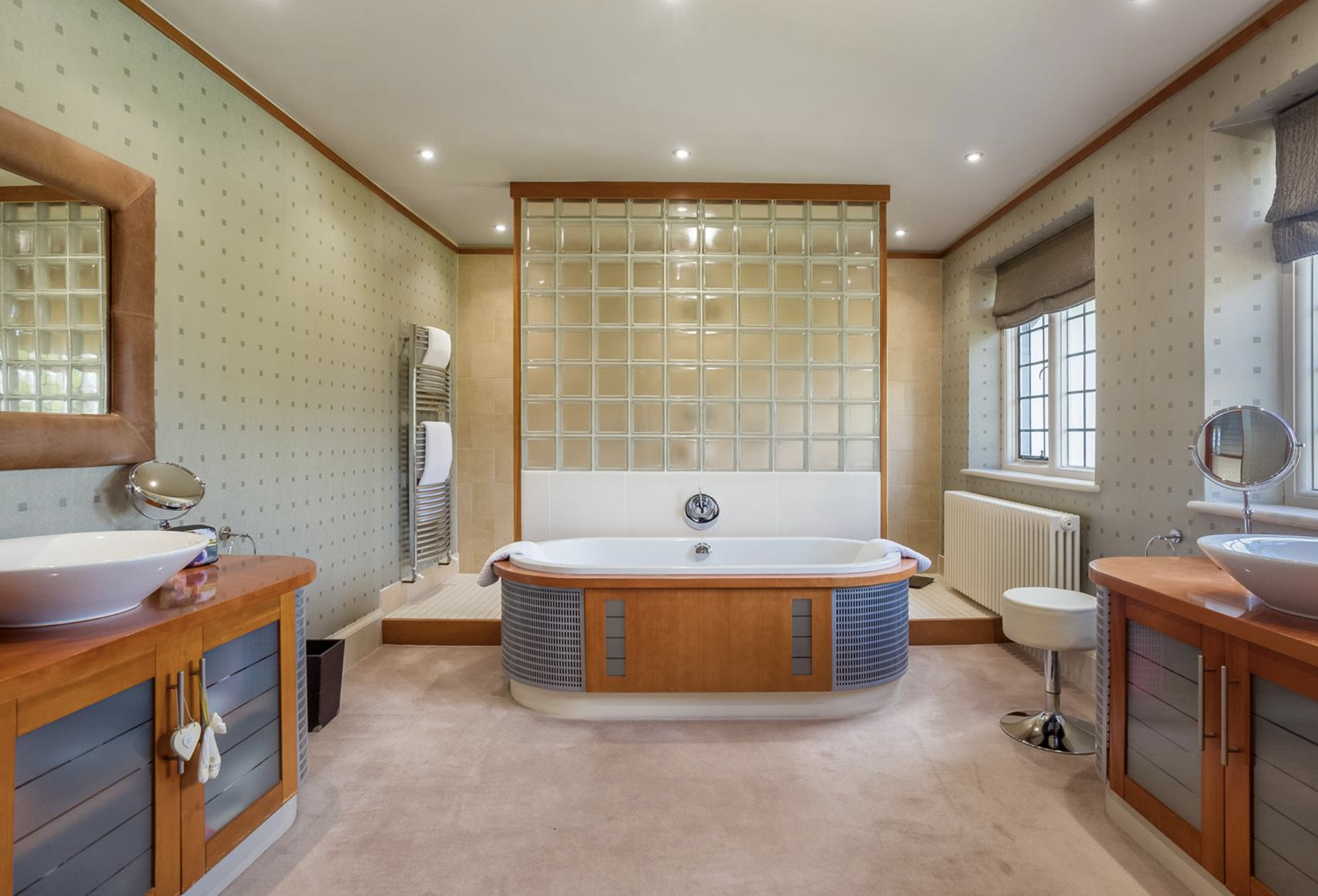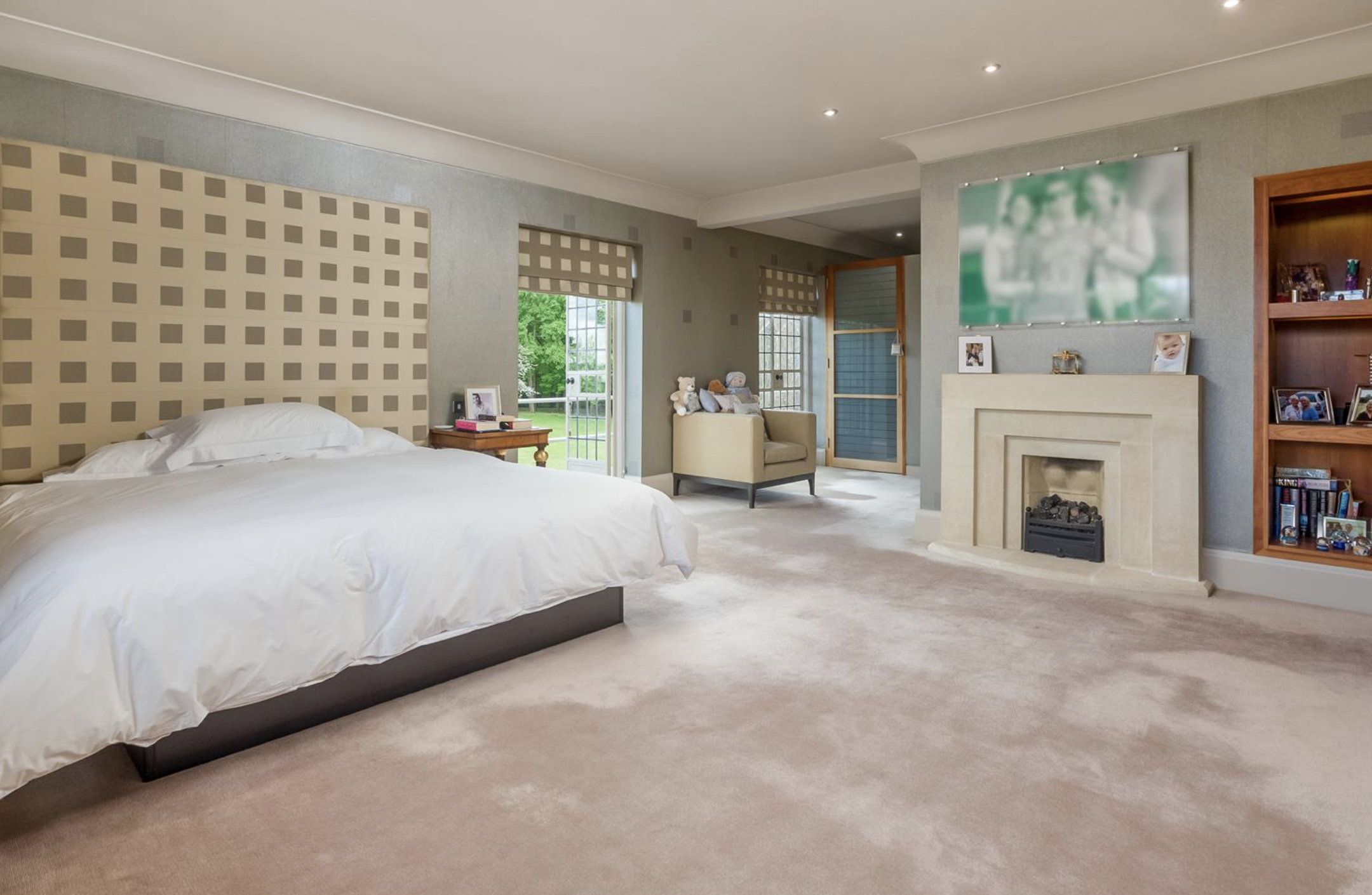 On the first floor on the right wing is bedroom one, which incorporates a dressing room, walk-in wardrobe, balcony terrace and en-suite, featuring a standalone bath and his and hers sinks.