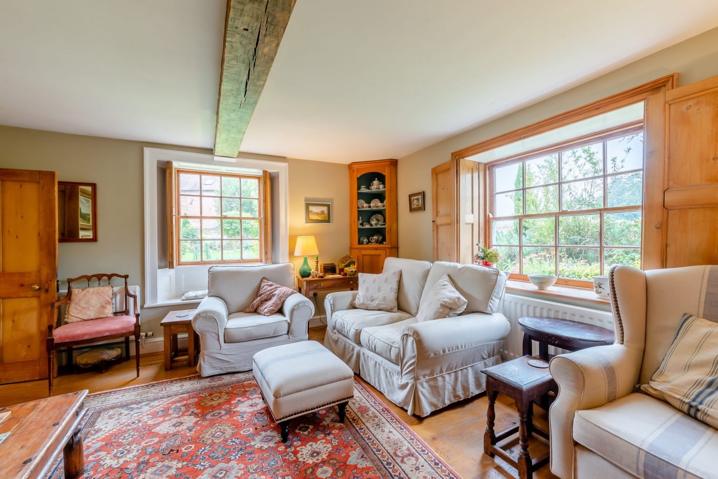 The dual aspect sitting room, with open fireplace, enjoys views over the adjoining countryside.