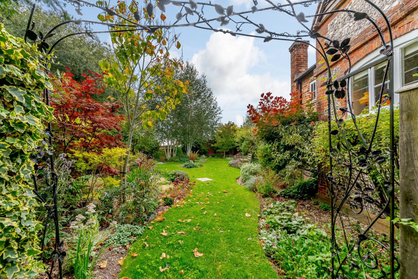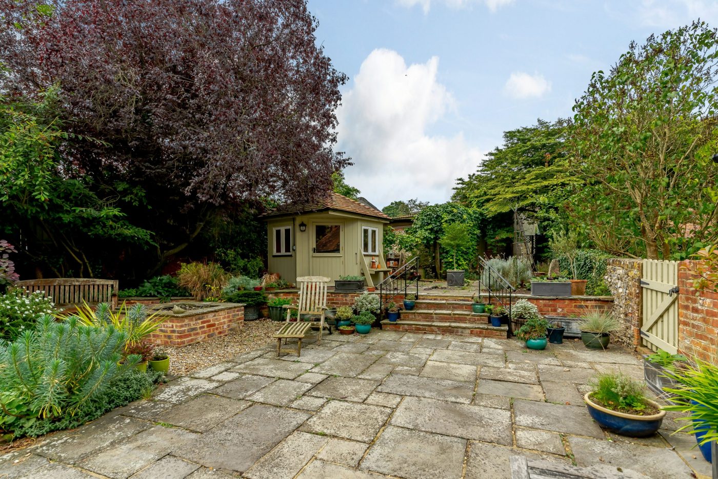 To the front is an area of level lawn, interspersed with various mature trees and shrubs and enclosed by a brick and flint wall. There is a paved terrace and further areas of lawn, together with a summerhouse and a well.