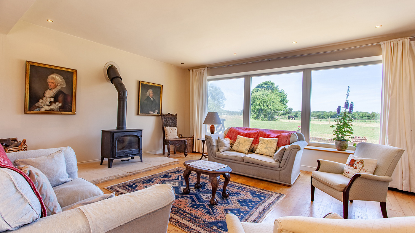 Inside, the kitchen/breakfast room has a vaulted ceiling and full-width windows, overlooking the courtyard garden with meadow and woodland views beyond. The part-vaulted “Long Room” includes a wood burner, perfect for cosy afternoons in after riding.