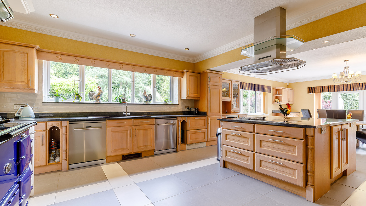 At the heart of the property is the kitchen and large breakfast/family area, featuring a gas-fired Aga, perfect for warming up after a winter’s morning out with the horses. There is a handy utility room, boot room and toilet — useful for any muddy dogs or wet riding gear.