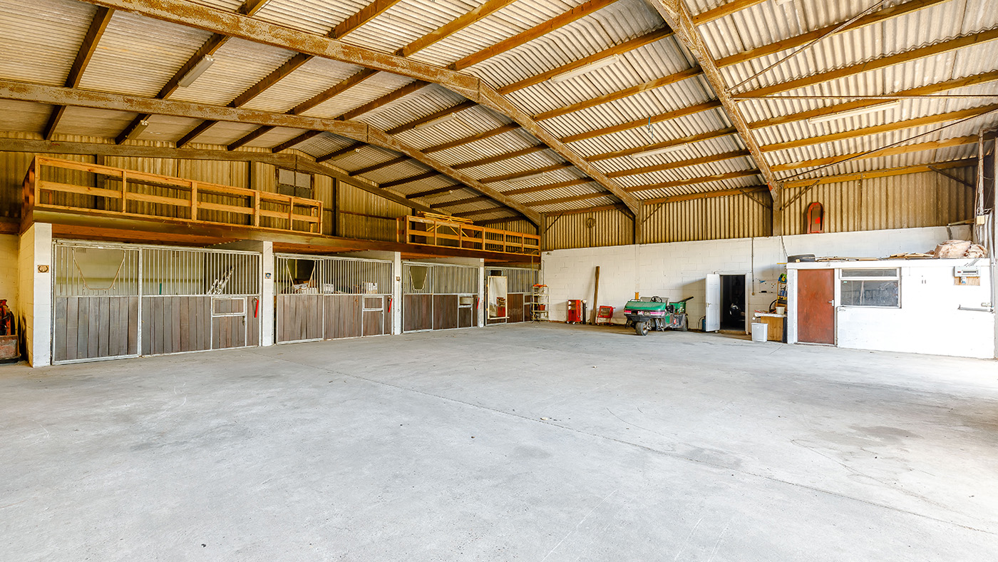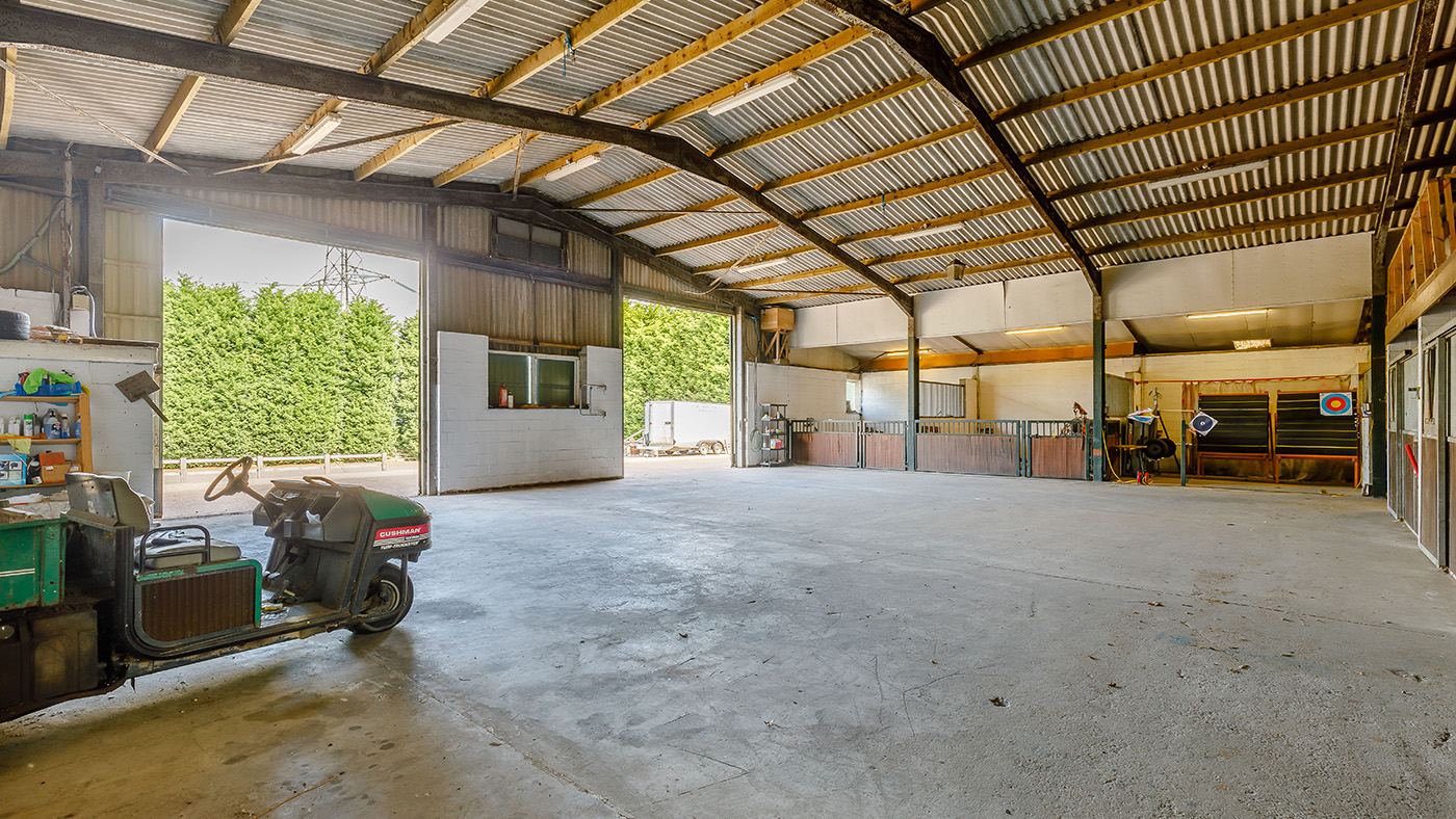 The equestrian facilities include an American-style barn boasting 12 stables, a tack room, an all-weather sand school and grassed paddocks. There is a machinery storage space, ideal for tractors or mowers, and the barn is equipped with power, light, and a water supply.