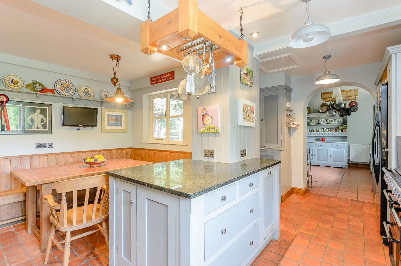 The kitchen/breakfast room has views over the orchard and includes a range of wall and base units, an AGA, an island with granite worktop and a built-in seating area.
