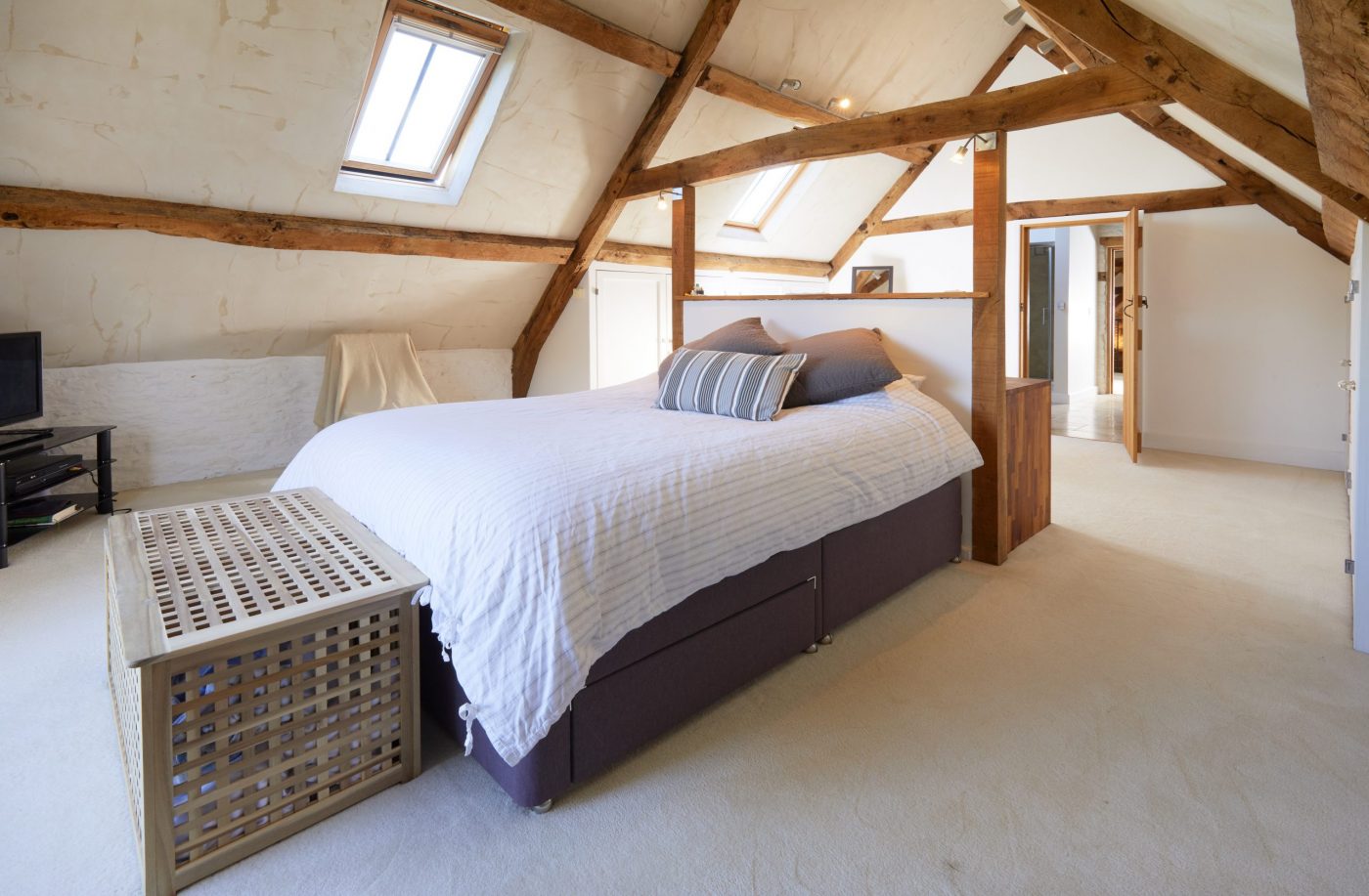 At the centre of the barn is a stunning open plan living area and kitchen spanning 40 feet. Features include an AGA oven and bi-folding doors opening outside to the garden.