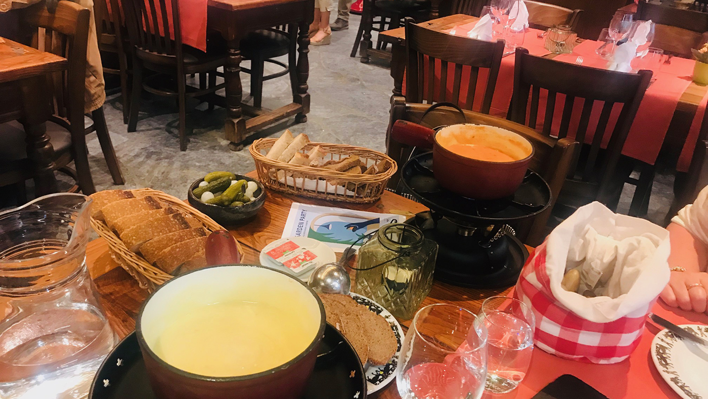 The town of Crans-Montana offers a variety of restaurants, so you can take your pick depending on what you feel like eating. However, if you want to sample something typical in Switzerland, a cheese fondue is a must — the Swiss love their cheese! It is rich but so good, and afterwards ask the waiter for some lemon sorbet with a shot of vodka — apparently it aids digestion…