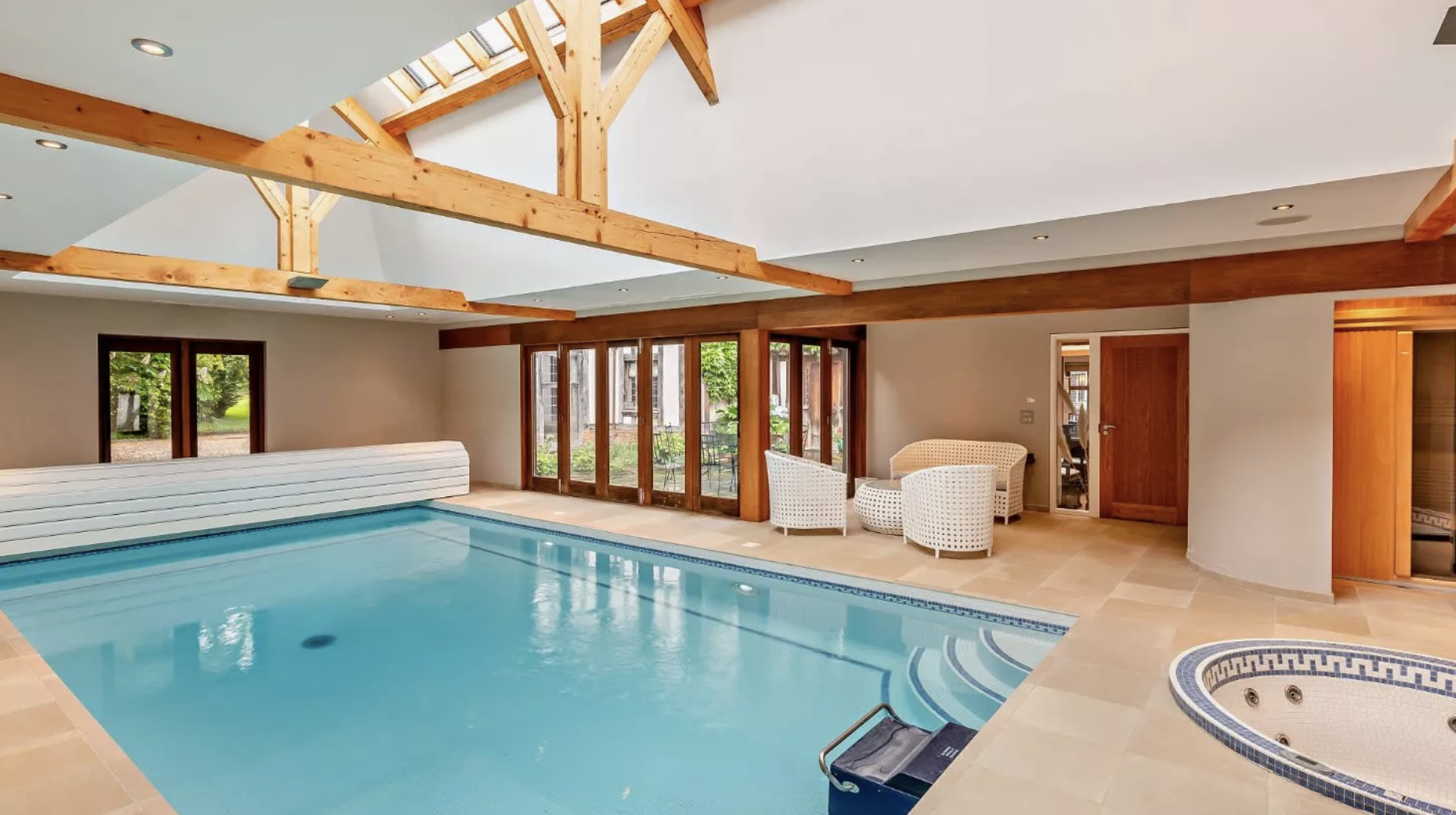 A vaulted indoor leisure complex has a lantern roof and bi-folding and French style doors that run across the building. There is also a sunken hot tub, sauna, changing rooms and showers.