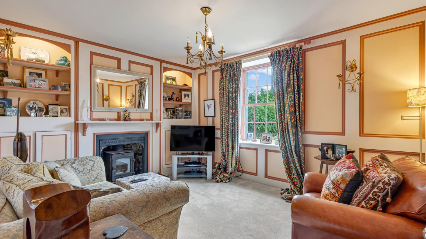 There is a front-facing, dual-aspect sitting room with casement doors that open onto the Italian-style ornamental garden.