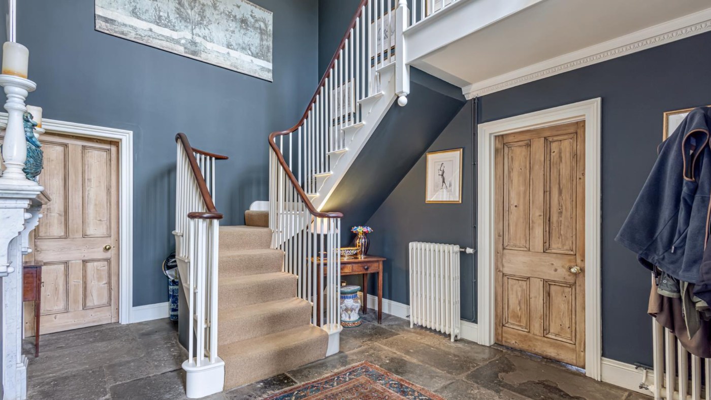 Just inside the front door is a flagstone-floored entrance hall and a Georgian-style staircase.