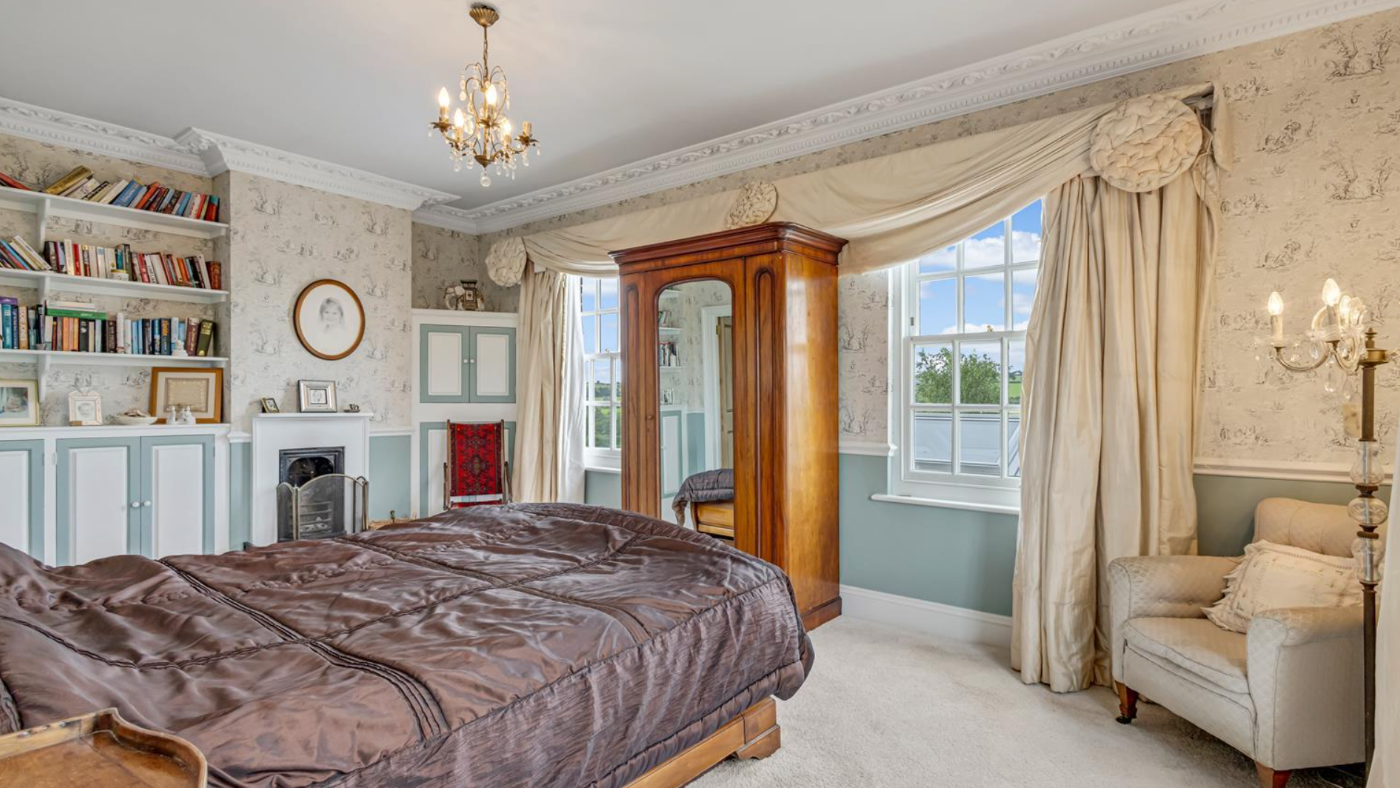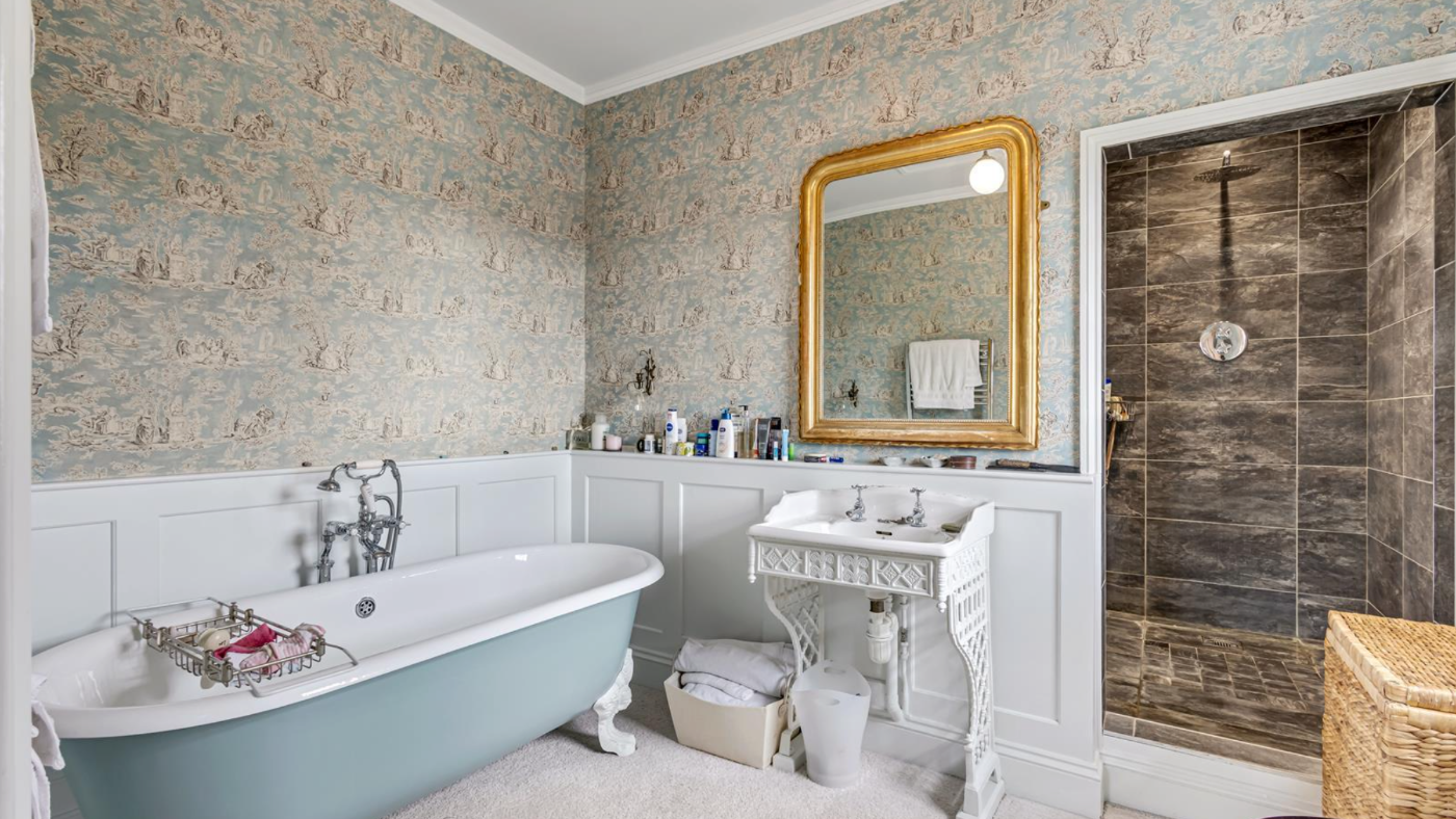 Upstairs, the principal bedroom has a dressing room and an en-suite bathroom, with a free-standing bath, basin and wet-room shower. Bedroom two has a built-in wardrobe and access to a Jack-and-Jill bathroom. Two additional bedrooms and a study complete the first floor.
