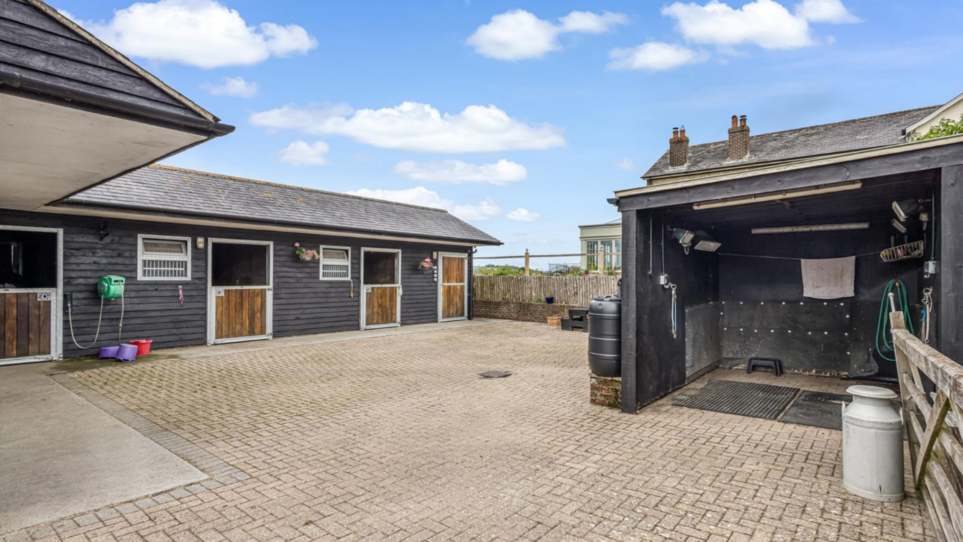 Starting with yard, there’s an L-shaped block of four stables with a tack room and two feed stores. There’s also a separate wash-down box.