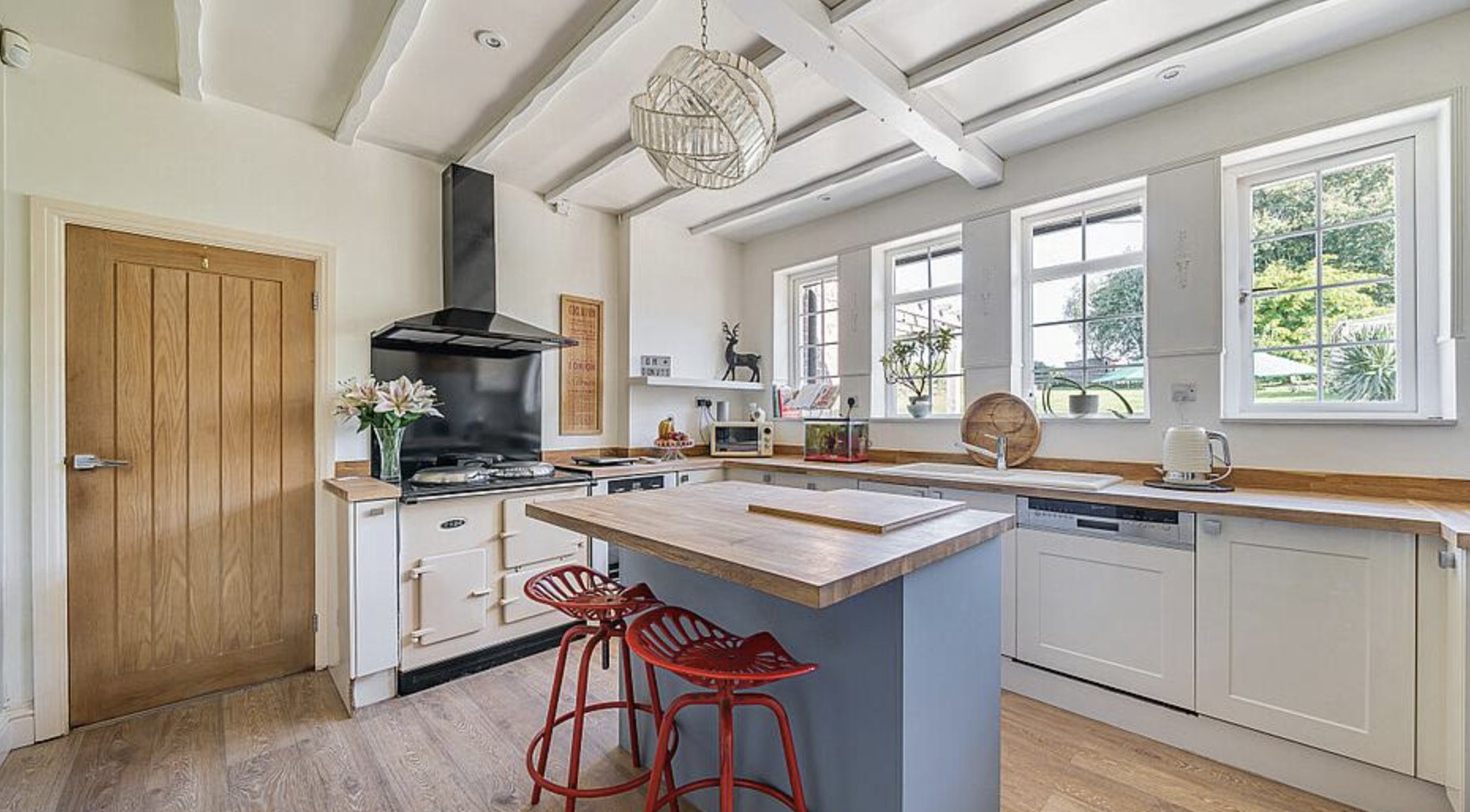 The dining room has windows looking out over the gardens, while the kitchen/breakfast room has a range of fitted base units with wooden work surfaces, a central island/breakfast bar, integral Neff dishwasher, electric oven, Esse cooker and space and plumbing for tall fridge-freezer.