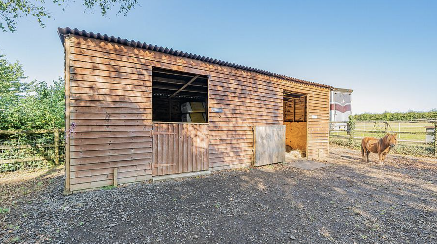 A gravelled yard currently houses two timber stables, both with EVA cushioned flooring, plus a further loose box and a lean-to for storage. To the rear there is a small hay store and a shed.