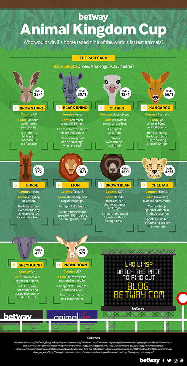 Using reliable speed and endurance data from sources such as National Geographic, WWF and Guinness World Records, Betway’s brilliant animated video (top) simulates how a race between these renowned speed demons – including stellar names like the cheetah, lion and brown bear – would likely play out… if it ever got the green light to run at Royal Ascot.