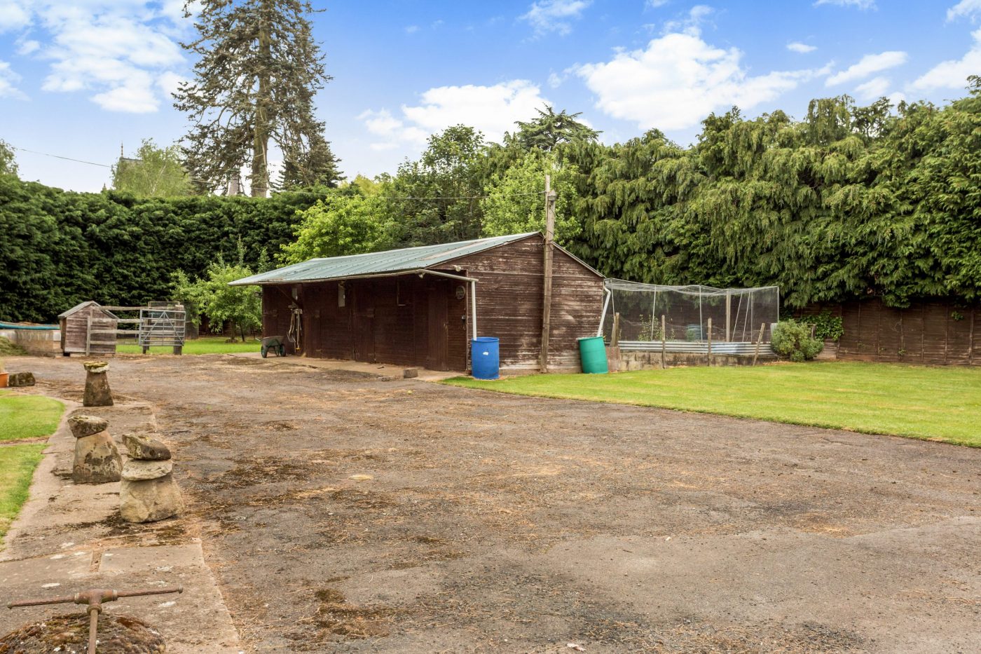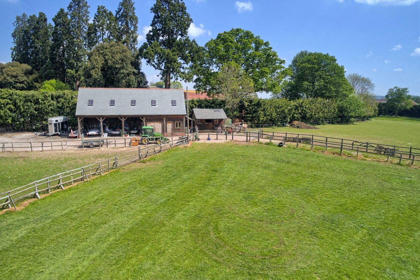 The property is accessed through electric gates and includes a stable yard with three loose boxes and a tack room. A more recently added three-bay open garage barn with a further workshop provides storage for additional vehicles and horseboxes. Adjoining the workshop is self-contained accommodation comprising a kitchen, cloakroom and two bedrooms.