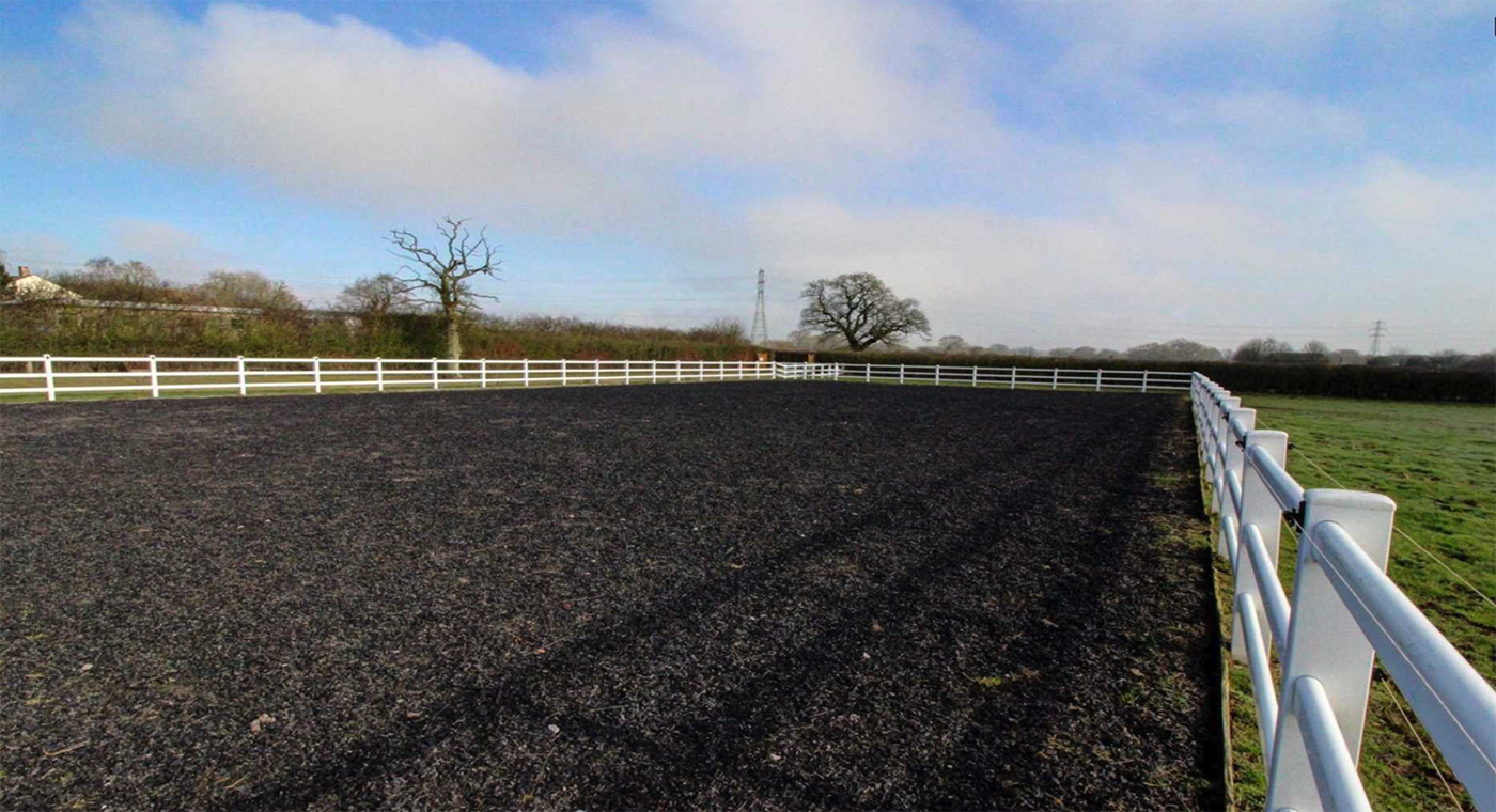 There is a 20x40m outdoor school situated to the left of the track with rubber/sand surface and white plastic fencing.