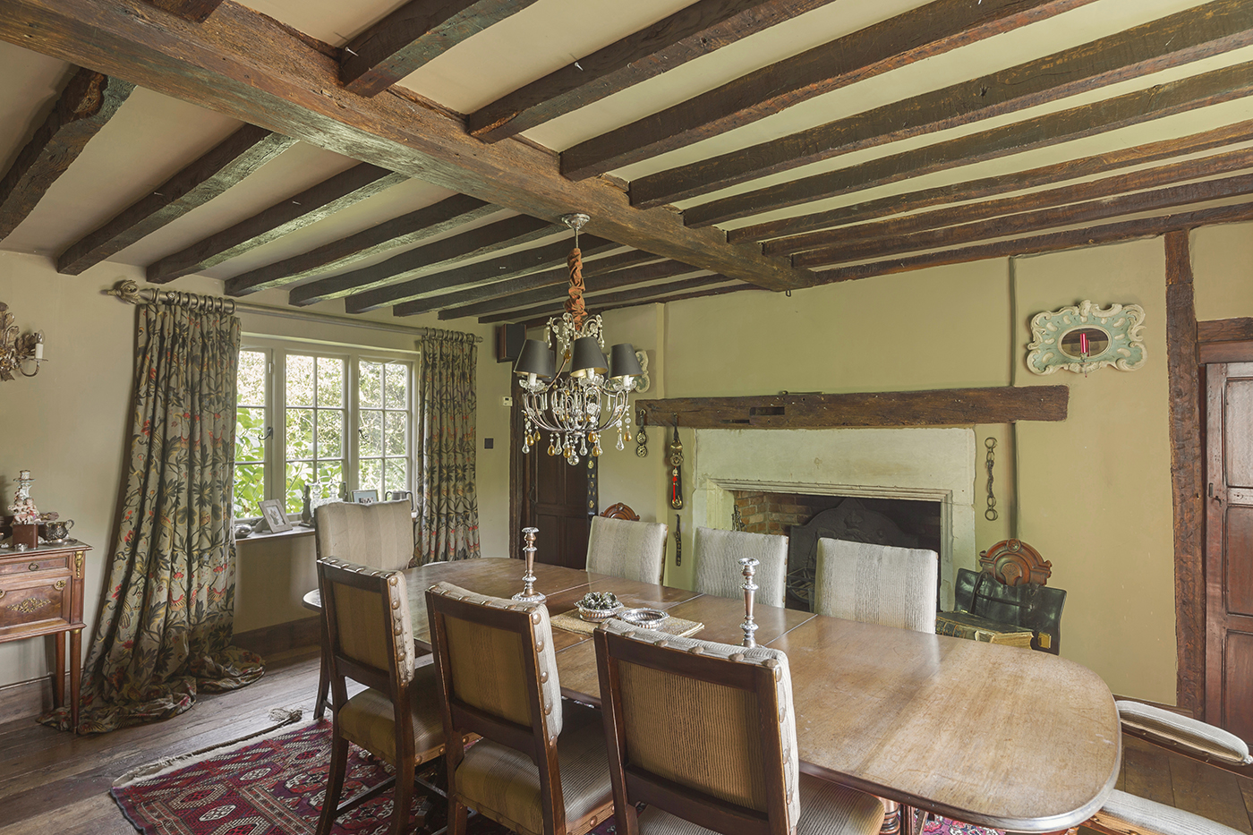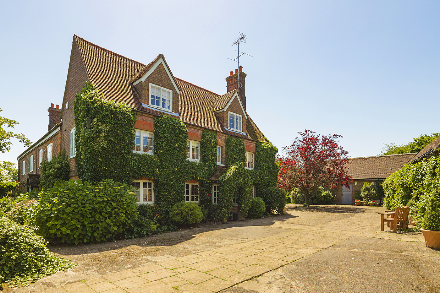 The home is Grade II-listed and is constructed of mellow red brick under a clay tile roof. The house was originally built in the early 18th Century. Features of the interior include exposed timbers and deep inglenook fireplaces.