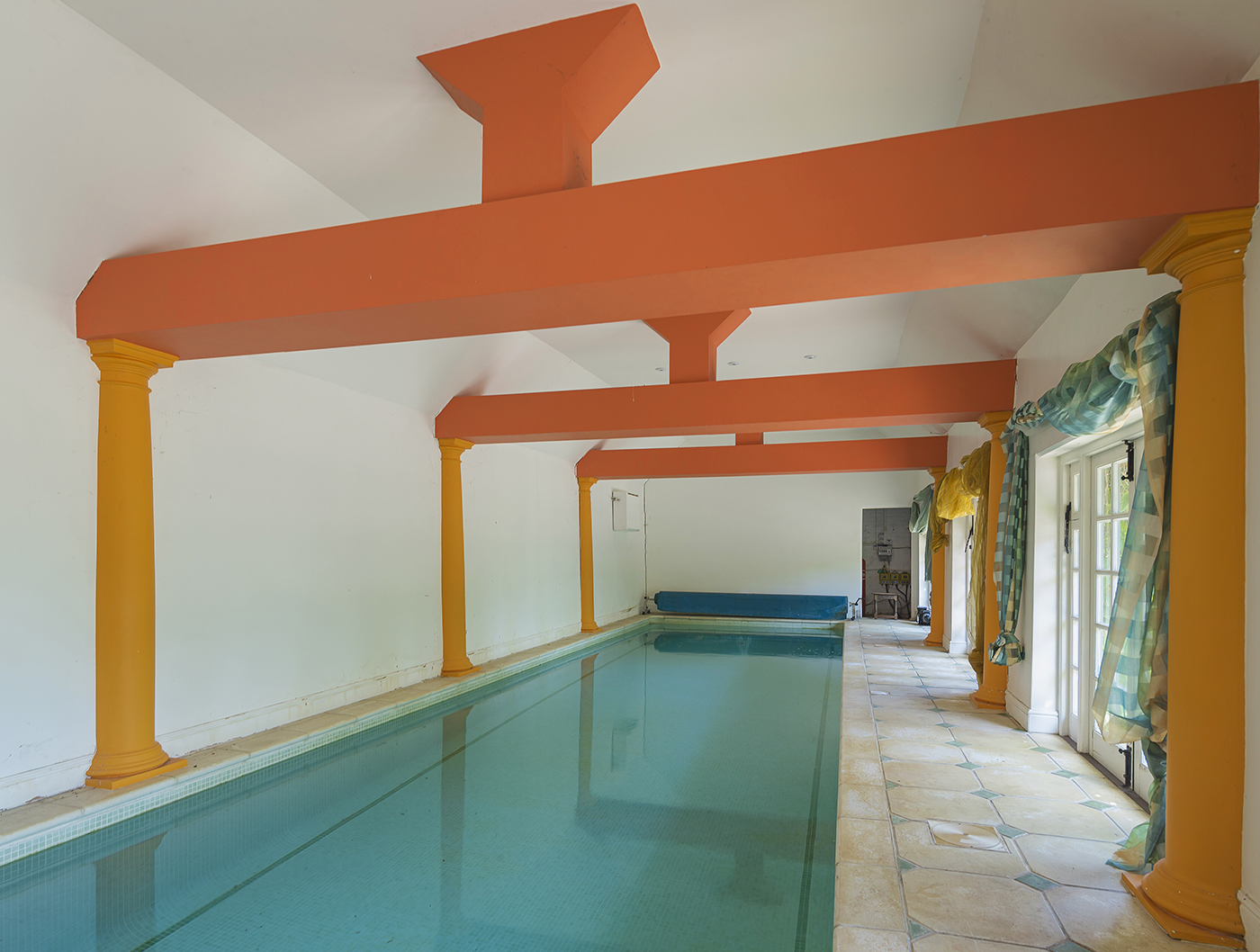Across the paved courtyard is the indoor swimming pool, gym and home office finished with polished panelling and fitted bookshelves.