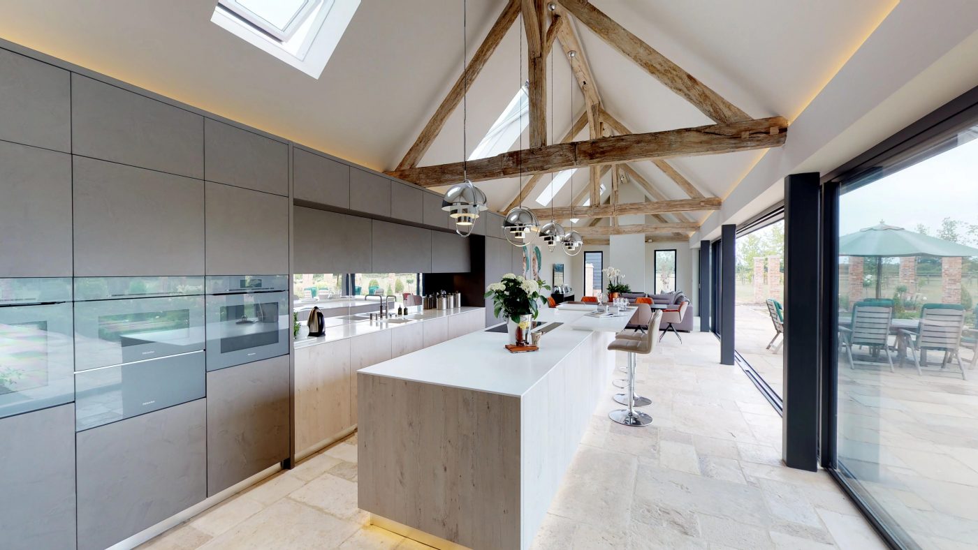 Check out this impressive kitchen/breakfast room. It has sliding patio doors that open out to the garden and it is fitted with a range of units and a large central island with an integral breakfast bar.