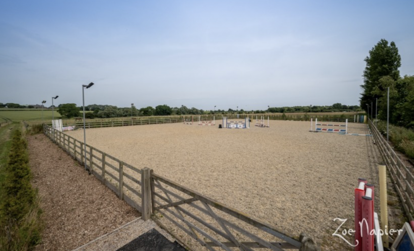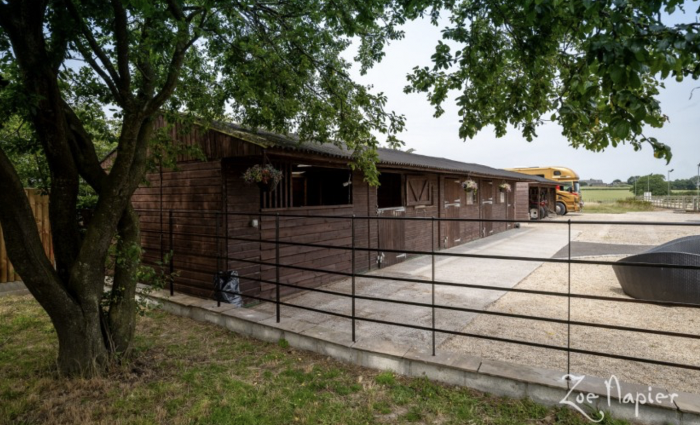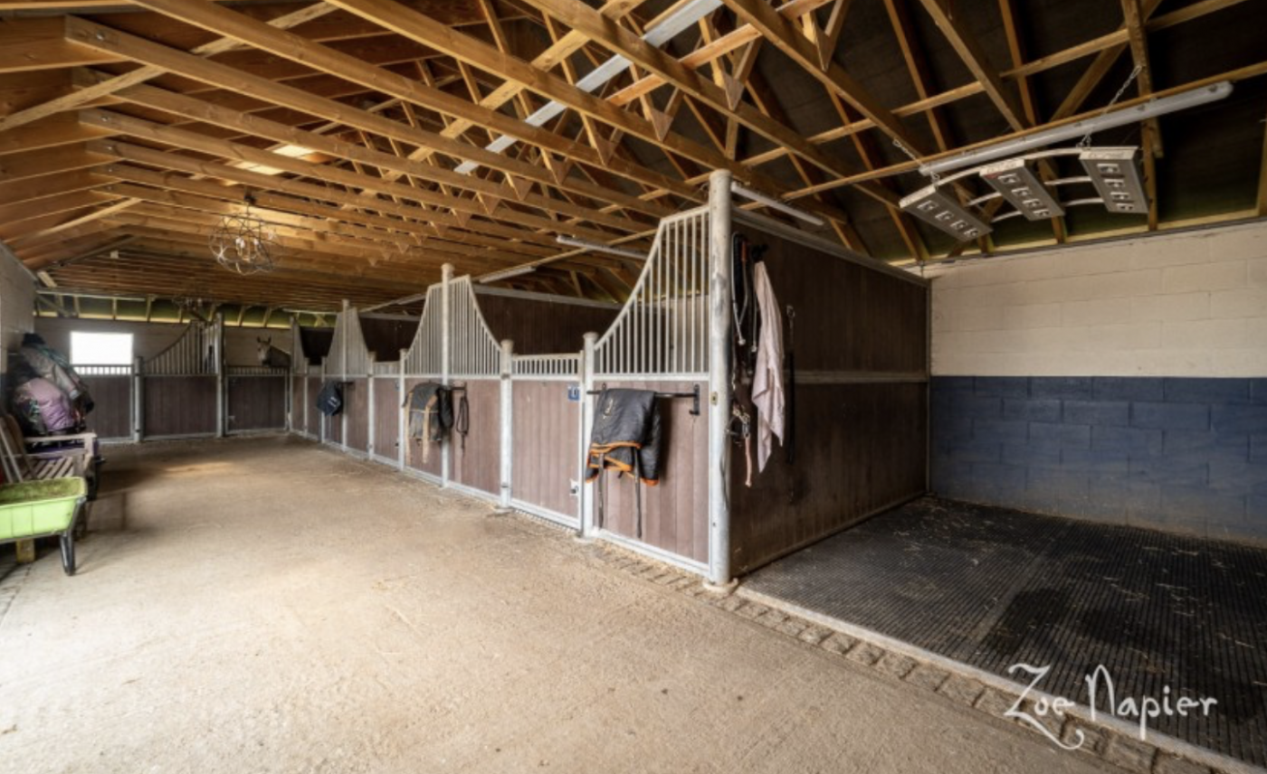 The American barn houses six large internal Monarch stables, all with automated waters and bonded rubber flooring. Three have windows to the rear of the barn and the others have a view to the front. There’s also a hot water wash down area with fitted solarium and a secure tack room and separate feed room.